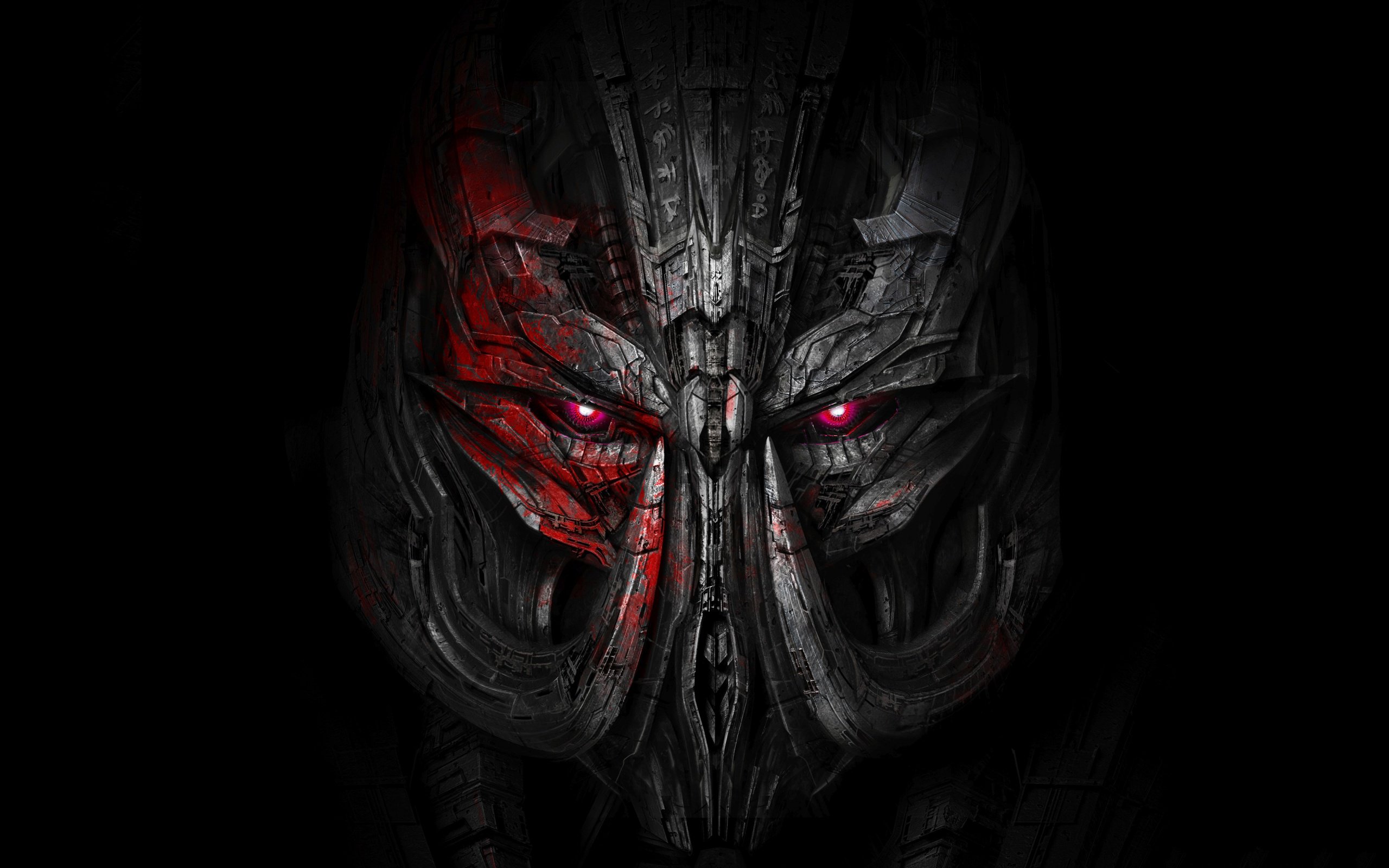 Description: A demonic looking mask with red eyes and a black background with a red light coming from it's eyes.