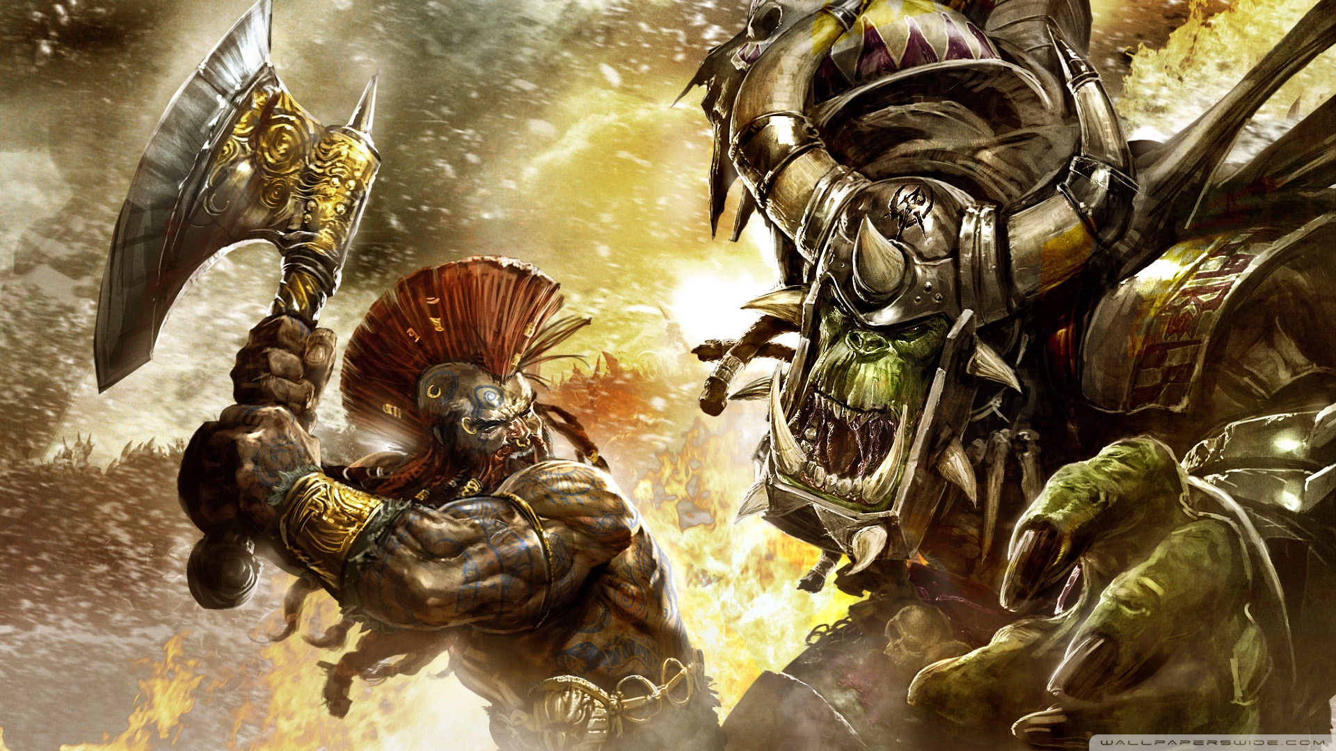 Description: Two demonic looking men fighting in a battle with a demon in the background.