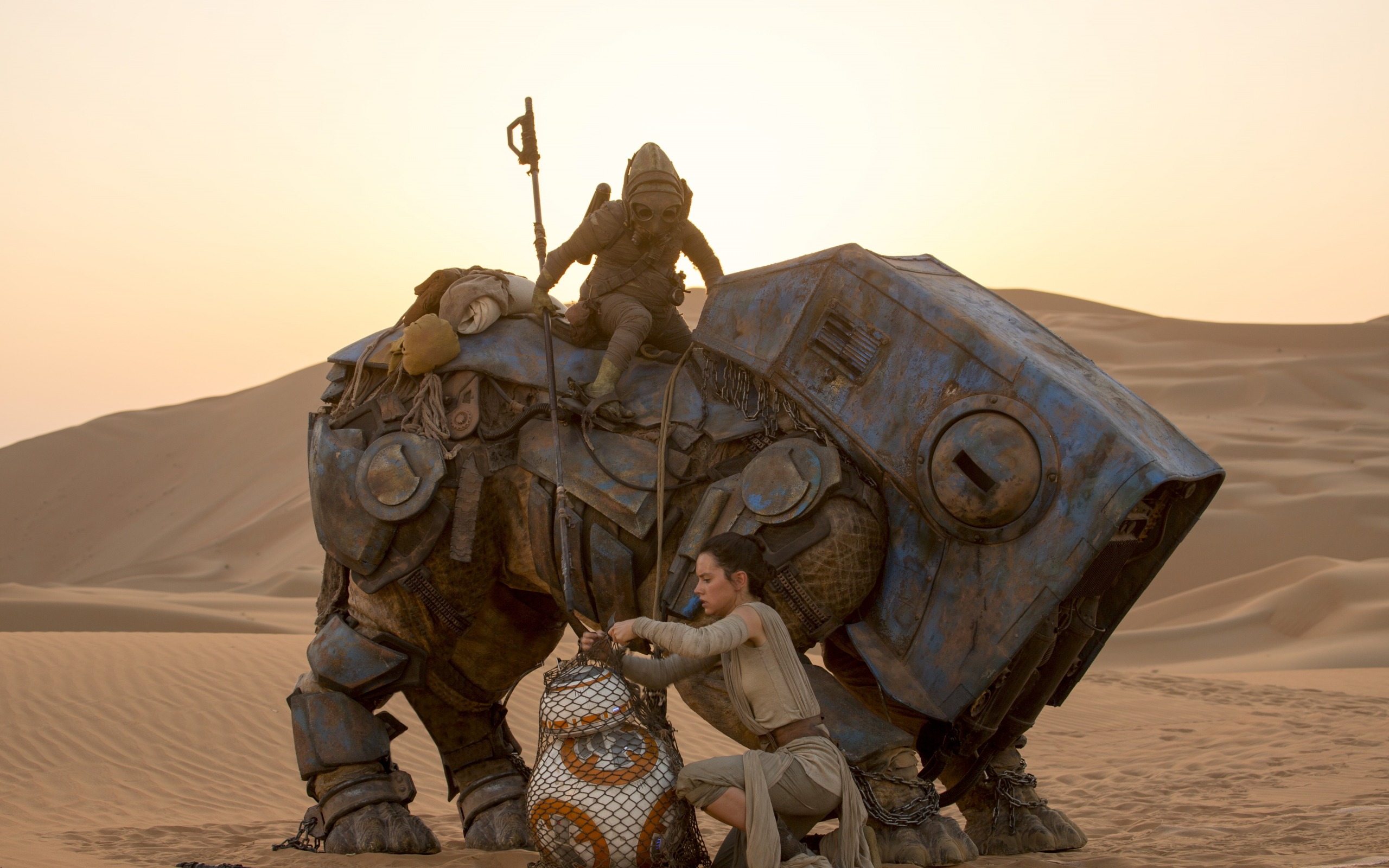 Description: A man is sitting next to a giant robot in the desert with a giant bag of stuff on his lap.