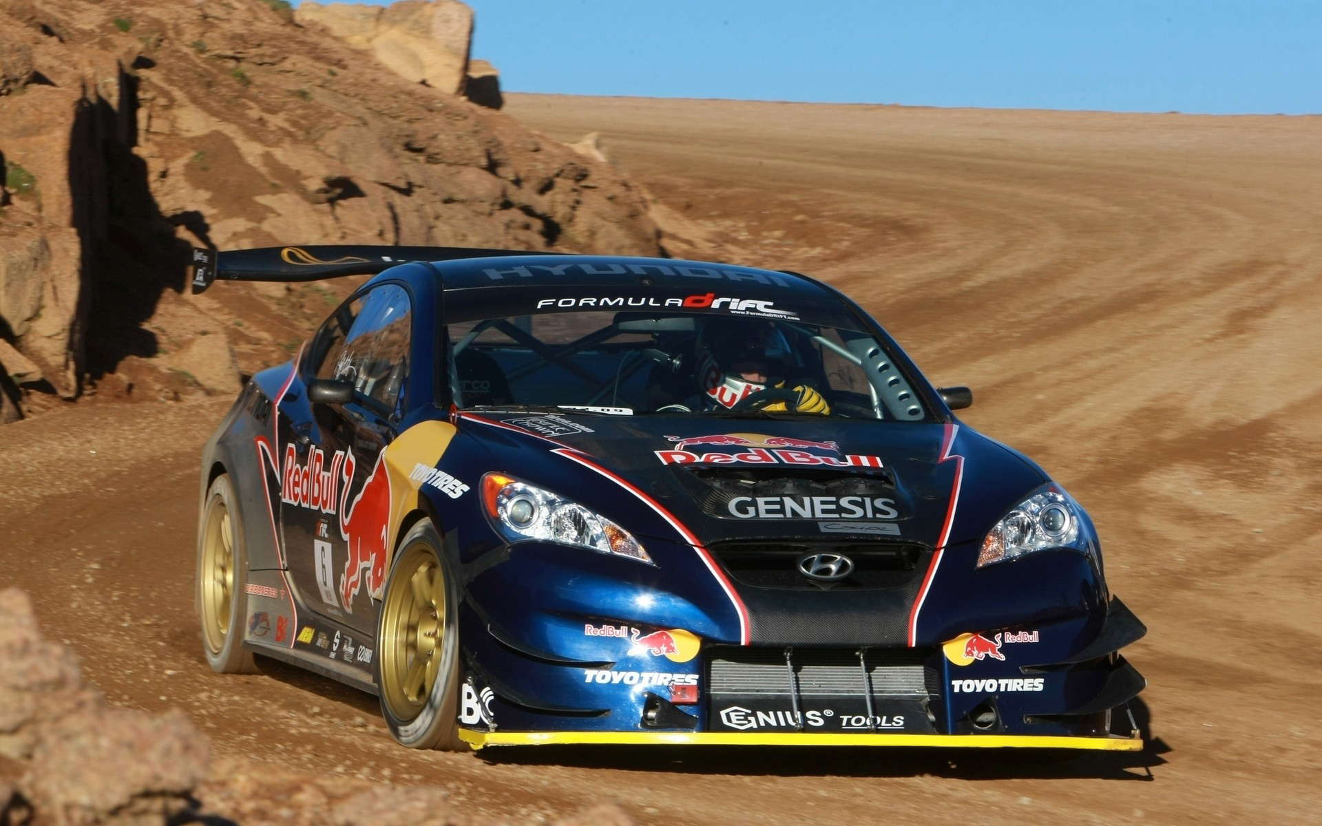 Description: A car driving on a dirt road in the desert with a sky background and rocks in the foreground.