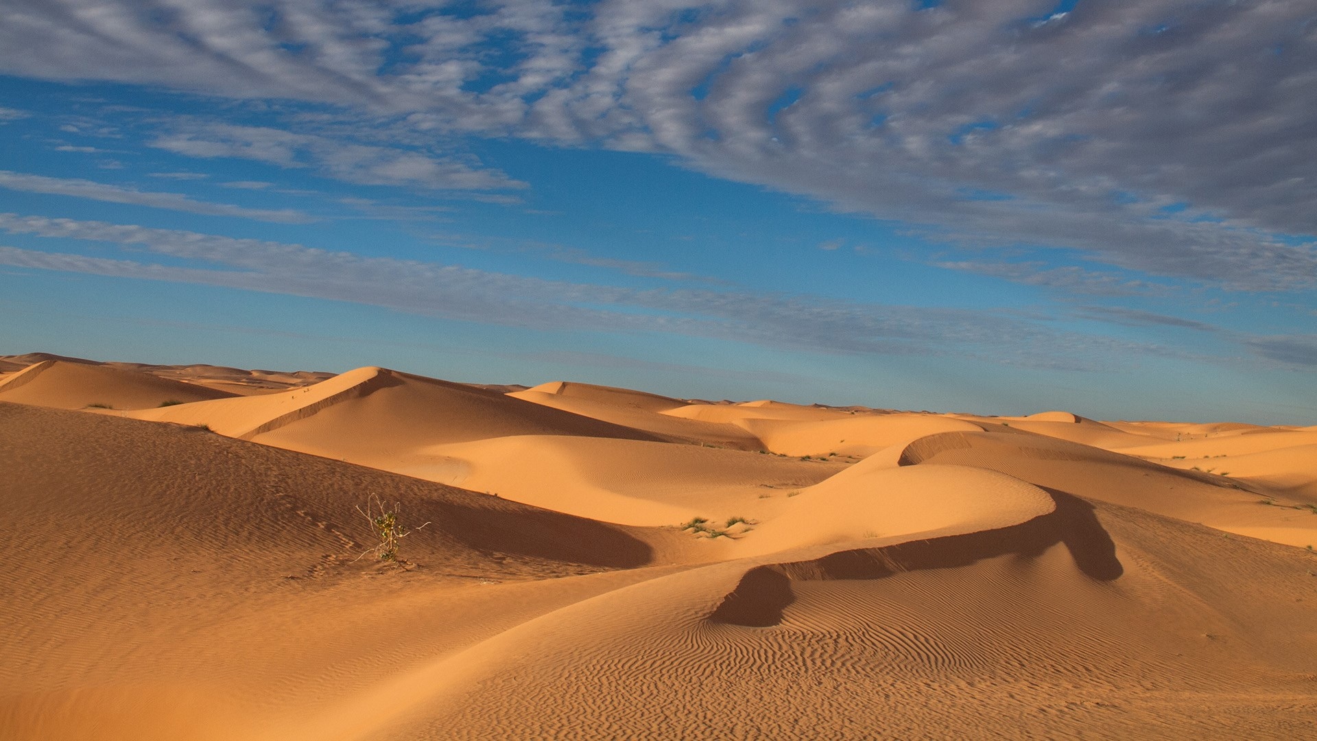 Description: A desert with a few clouds in the sky above it and a few sand dunes in the foreground.