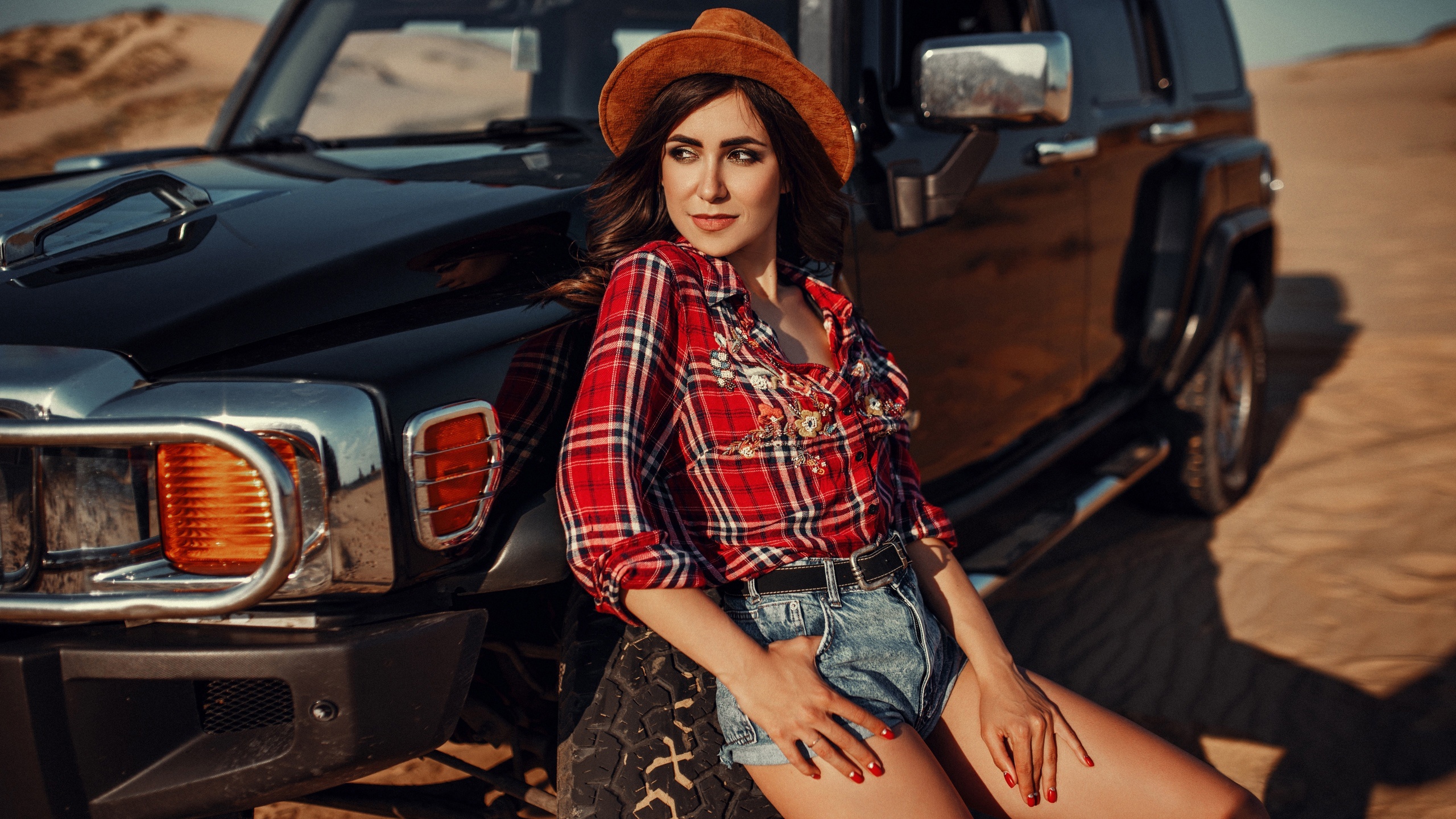 Description: A woman in a cowboy hat leaning on a truck in the desert with her legs crossed and her hand on her hip.