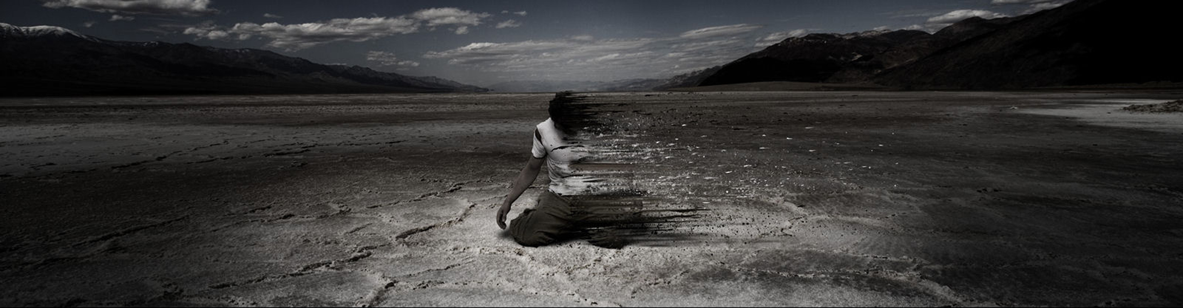 Description: A black and white photo of a desert landscape with mountains in the background and a dark sky with clouds.