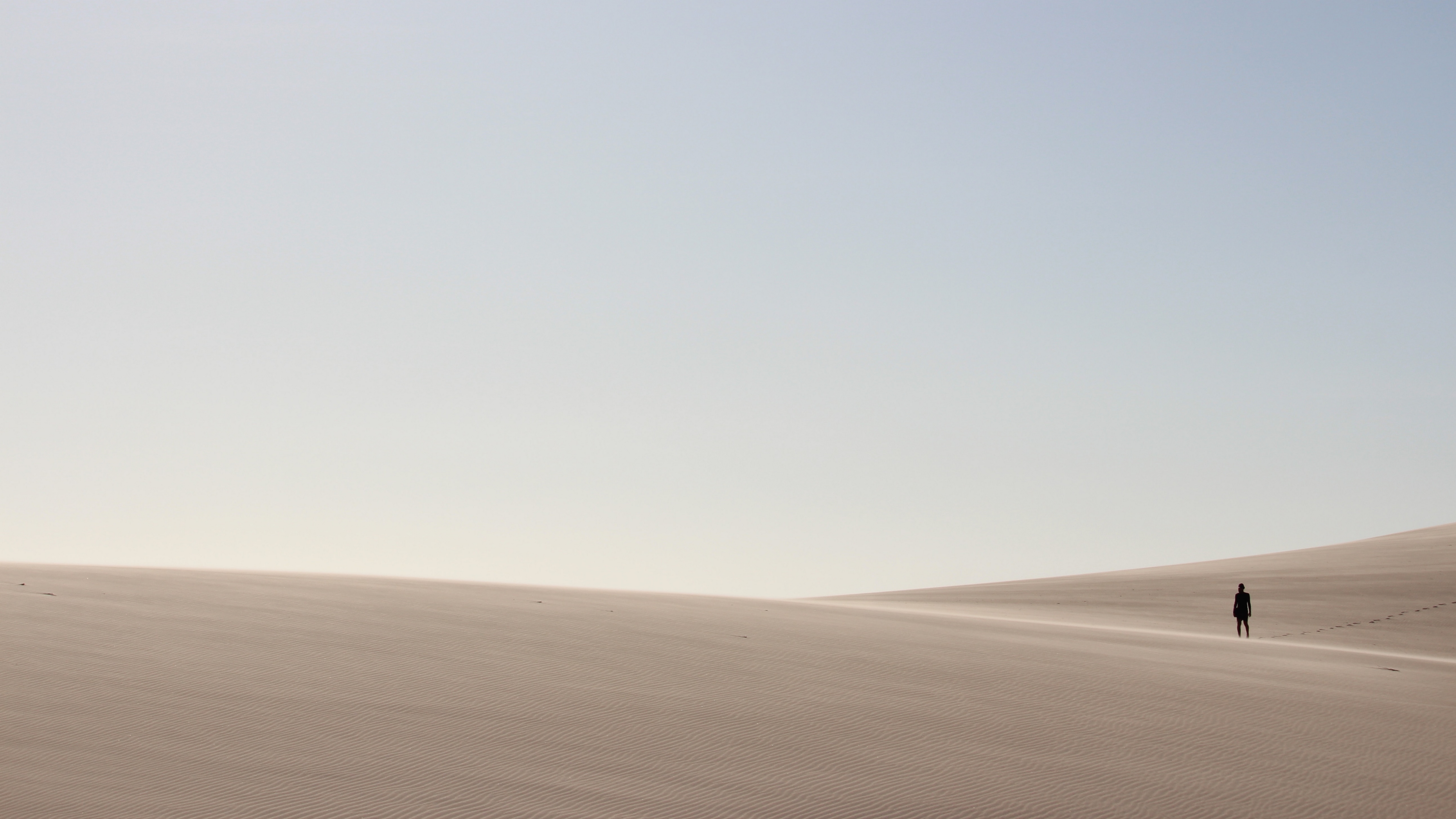 Description: A lone person walking across a large sandy field of sand dunes in the desert.