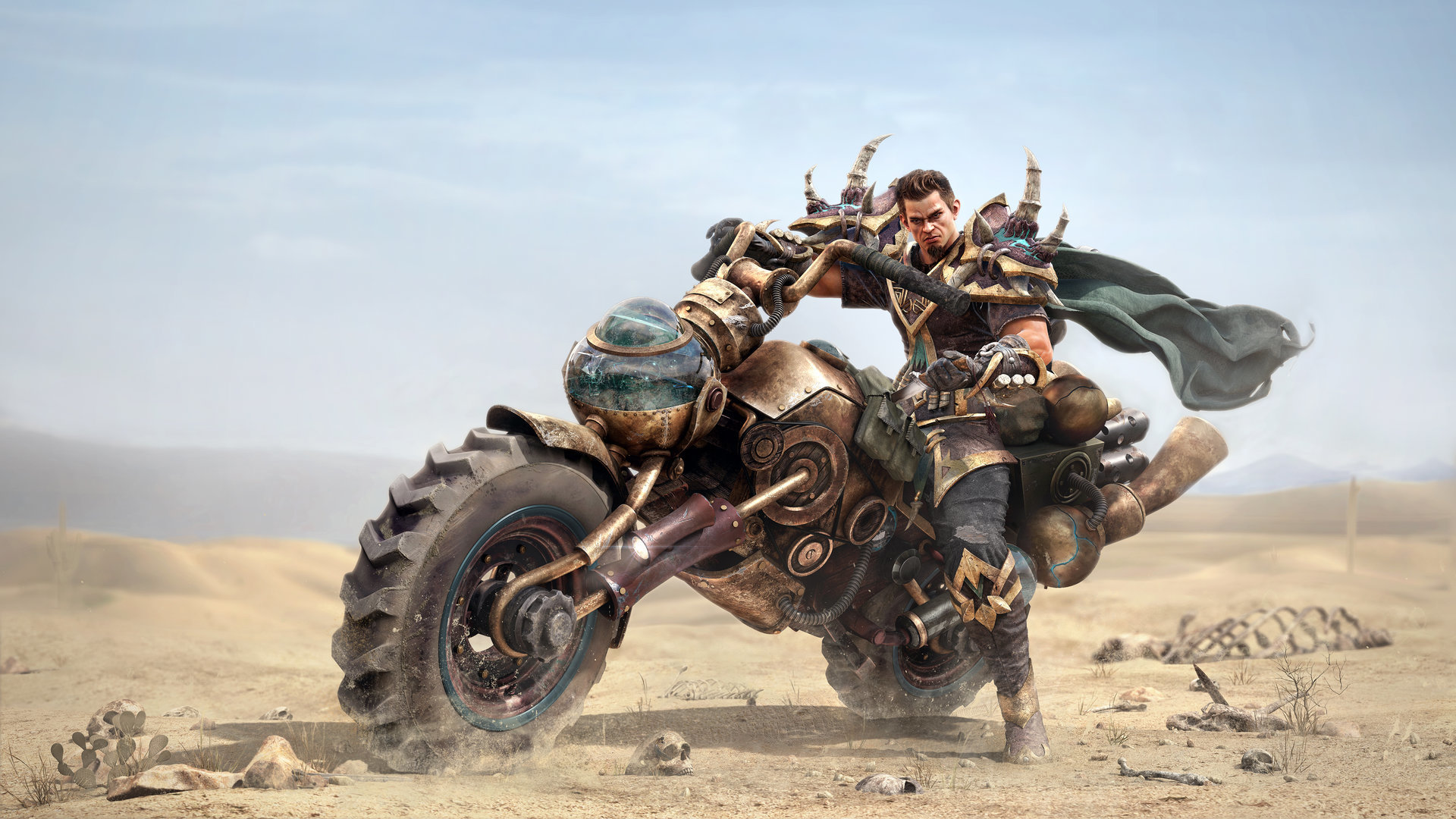 Description: A man riding a motorcycle in the desert with a cape on his head and a cape on his shoulders.