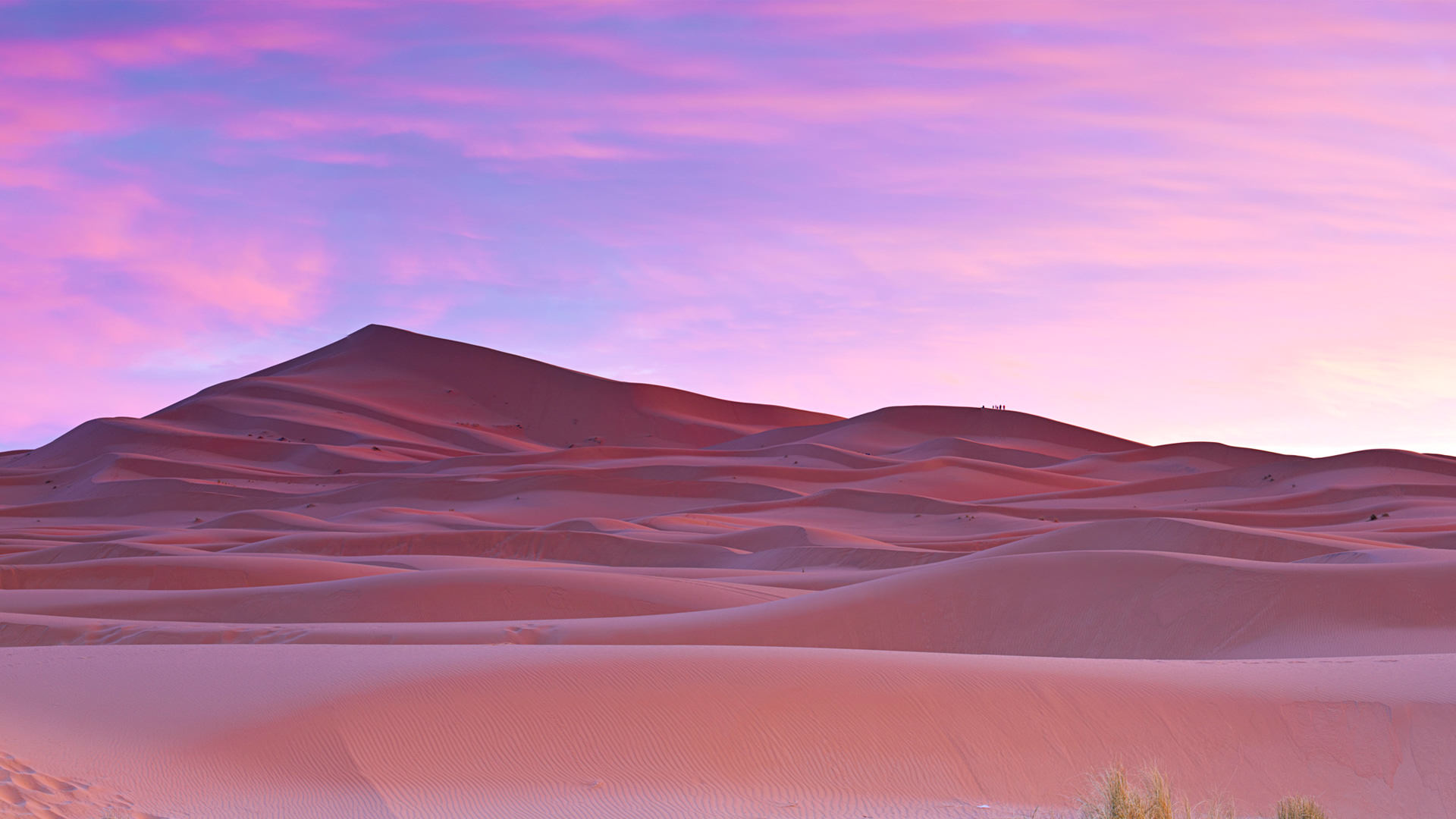 Description: A desert with a mountain in the background and a pink sky above it with clouds in the distance and a few bushes in the foreground.