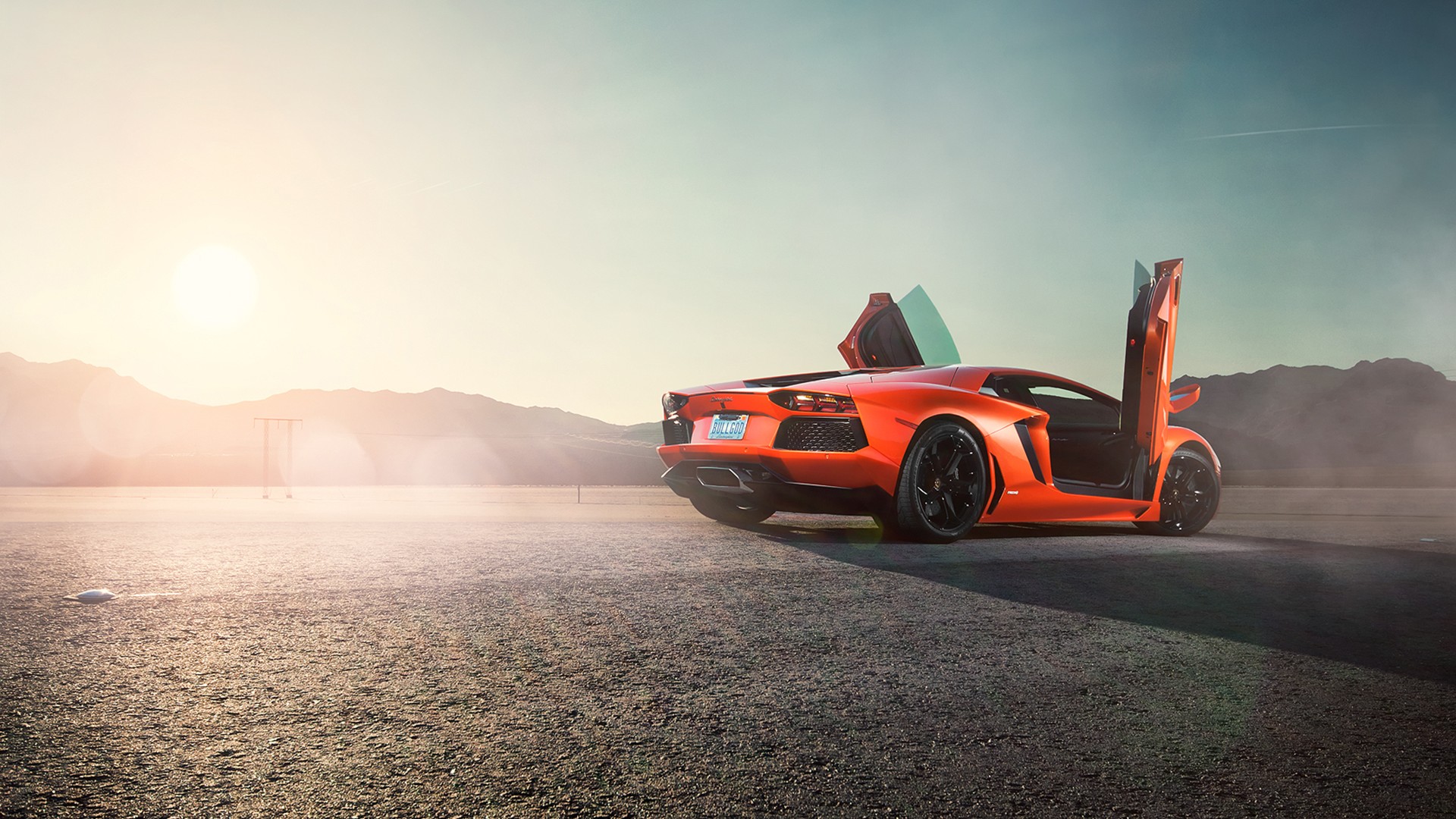 Description: A very nice looking car with its doors open in the desert with mountains in the background and a bright sun.