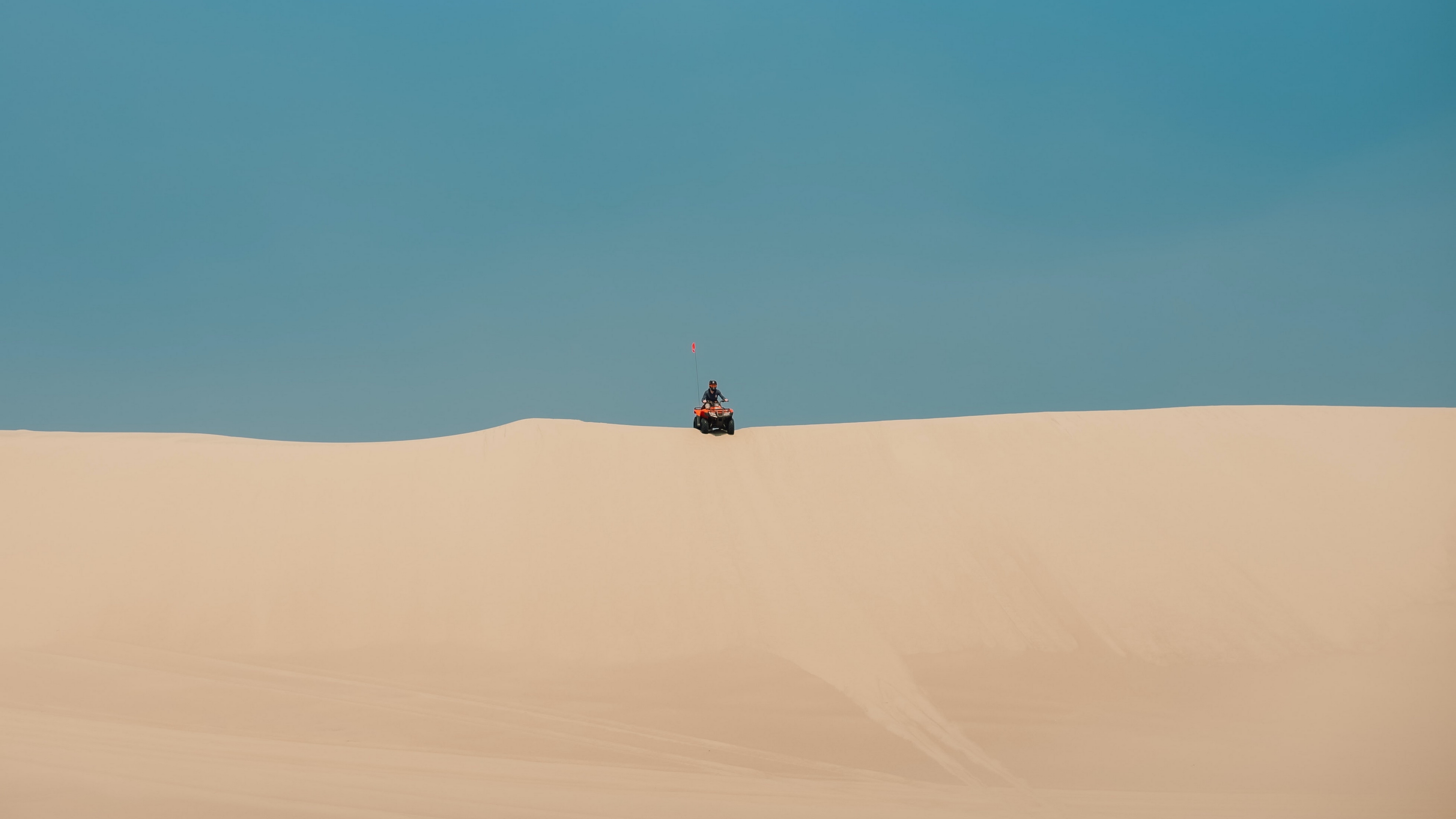Description: A person riding a four wheeler in the desert on a clear day with a blue sky in the background.