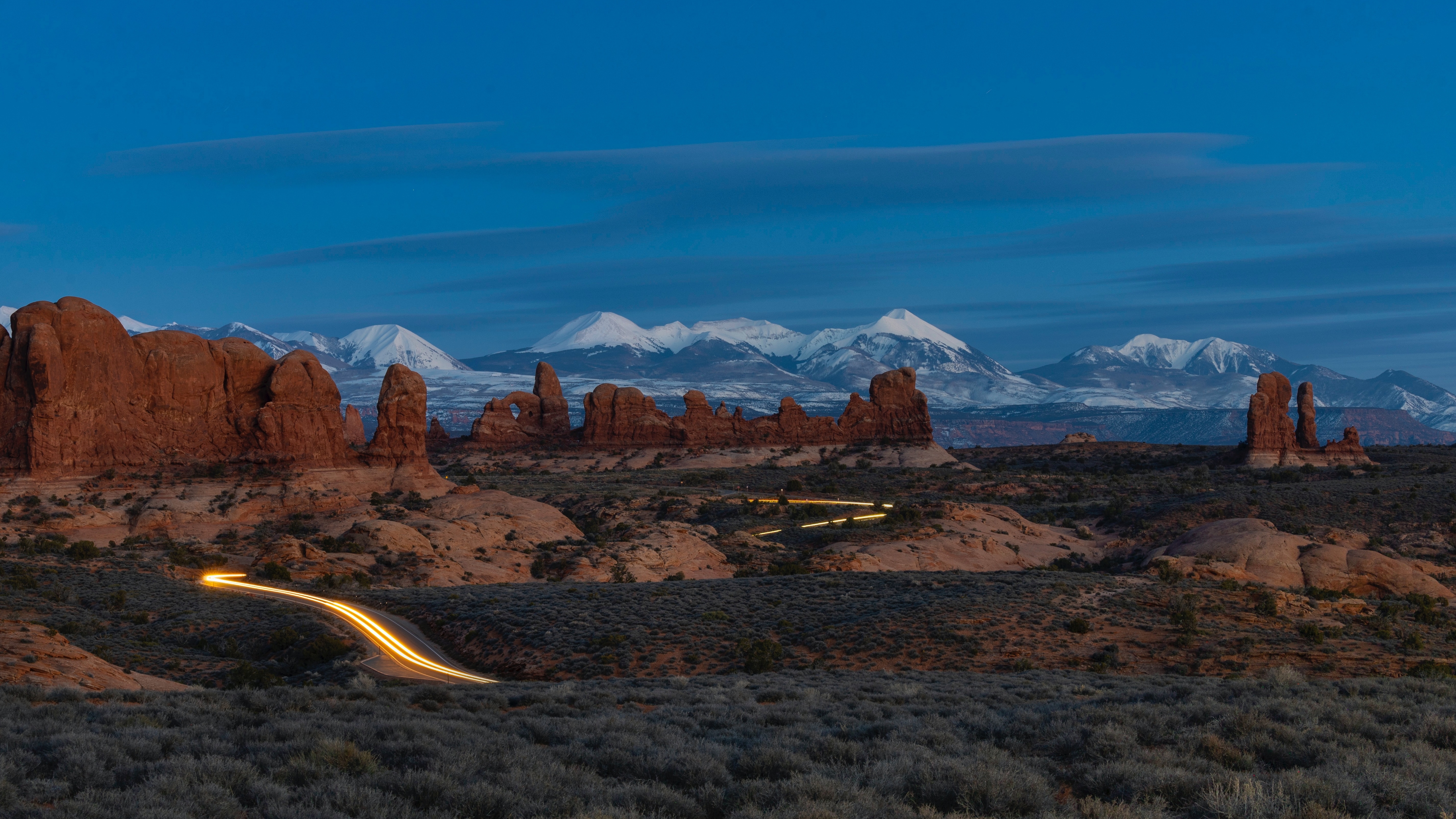 Description: A road in the middle of a desert with mountains in the background at night time with light trails going through the road.