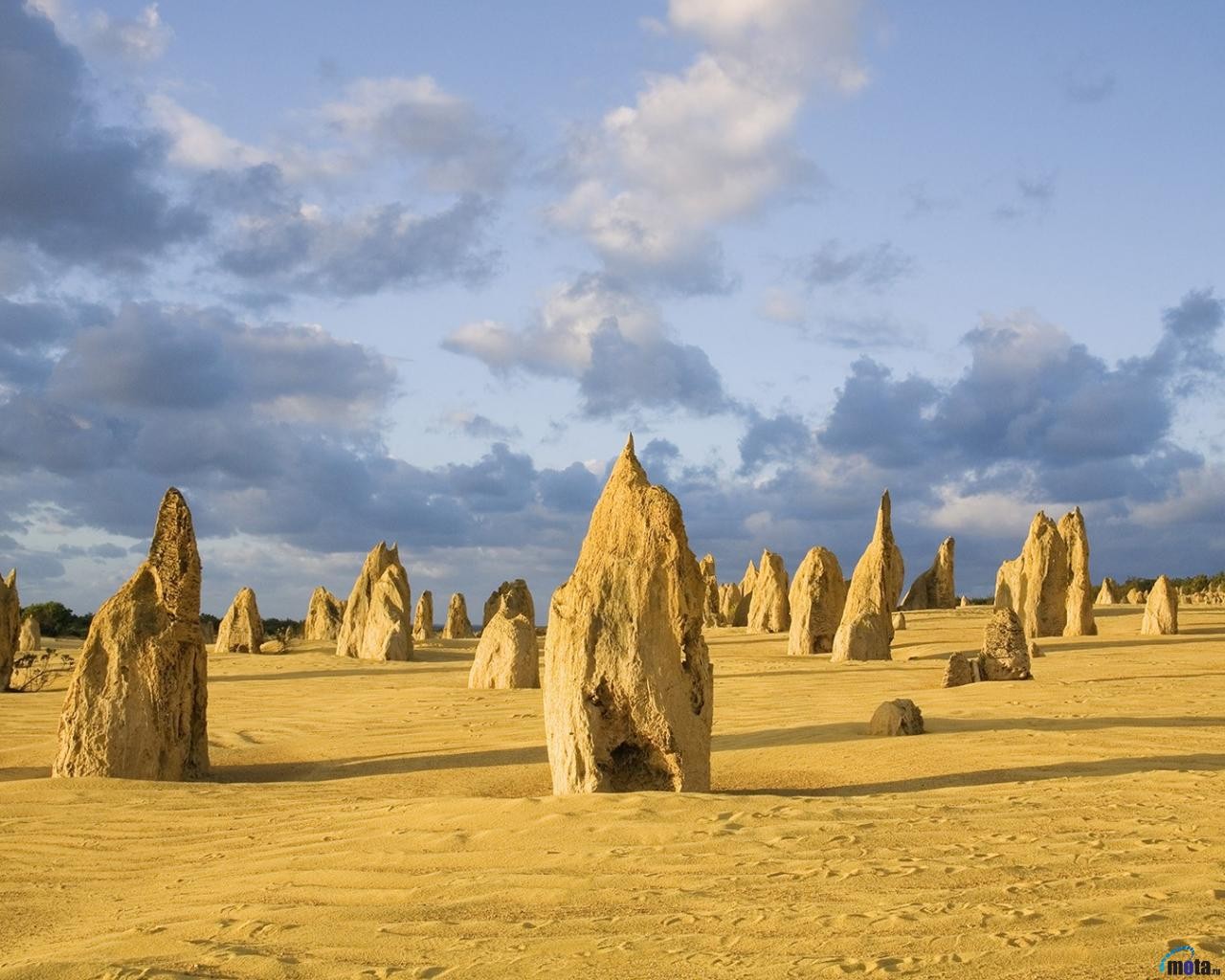Description: A desert with a bunch of rocks in the middle of it and a cloudy sky above it with a few clouds.
