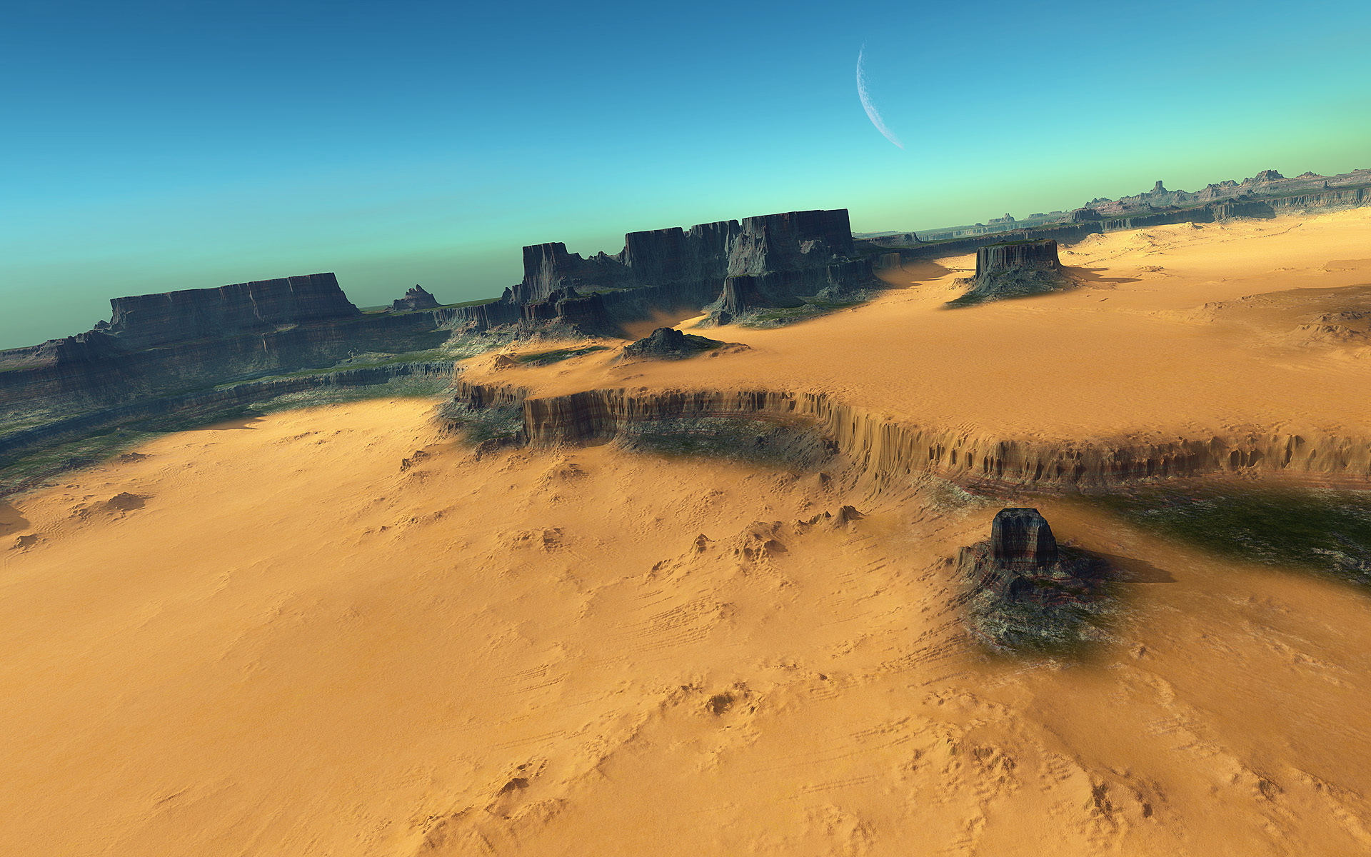 Description: A computer generated image of a desert landscape with rocks and sand dunes and a blue sky in the background.