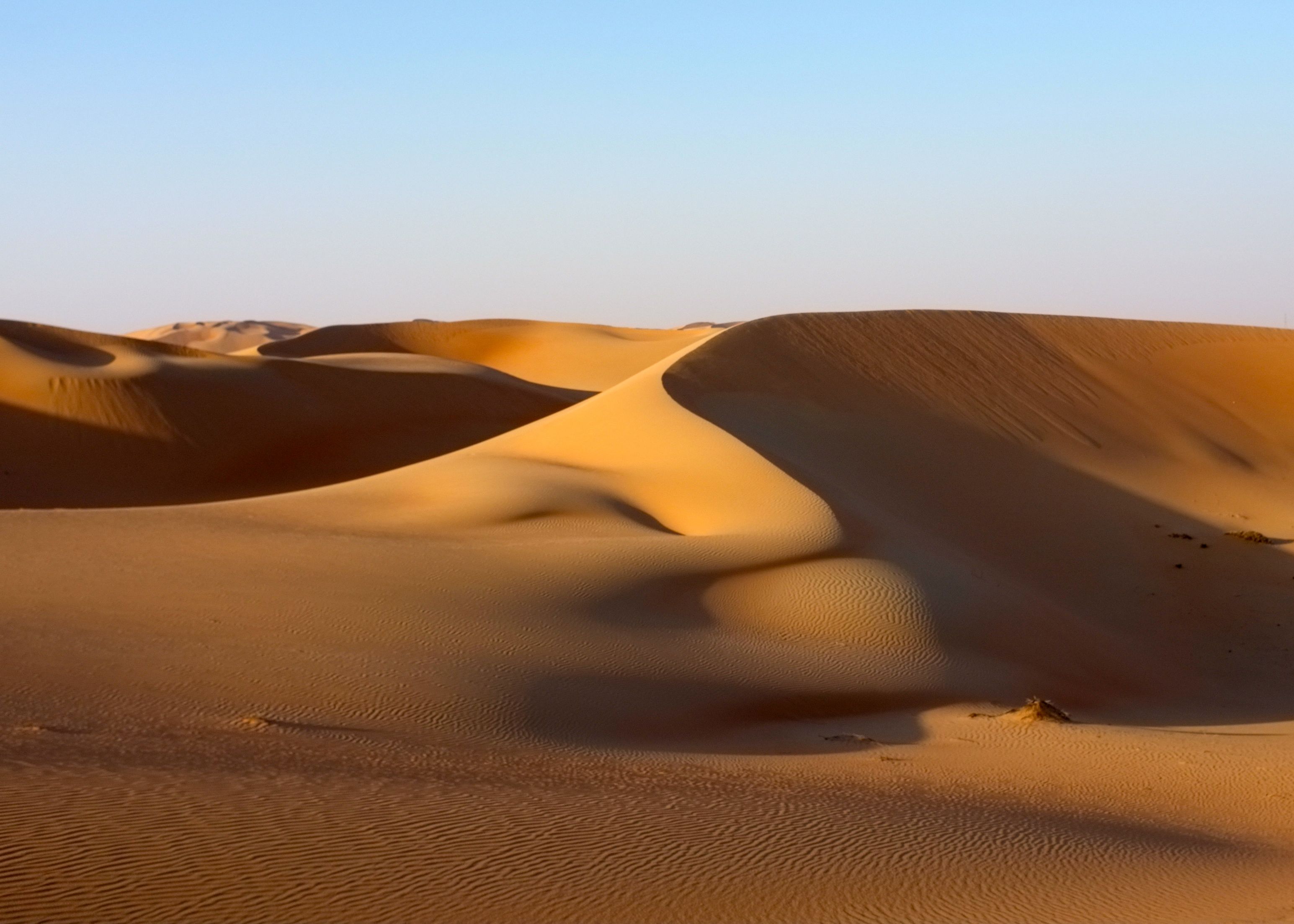 Description: A desert with a few sand dunes and a blue sky in the background.