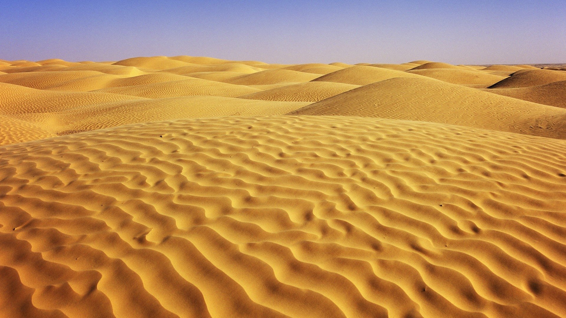 Description: A desert with a lot of sand dunes and a blue sky in the background.