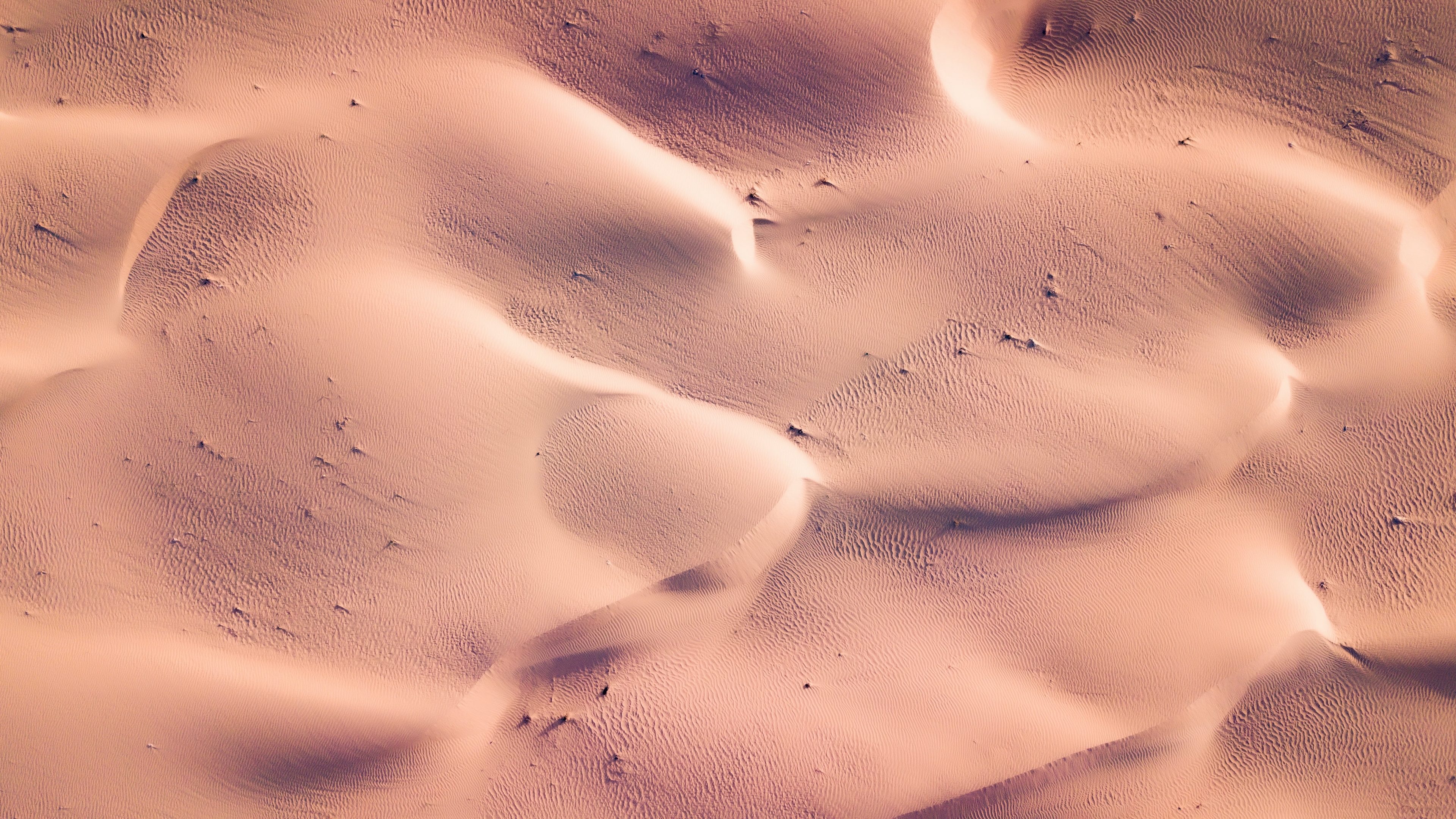 Description: A desert with a lot of sand dunes and a sky background that is very soft and blurry and shows the sand blowing in the wind.