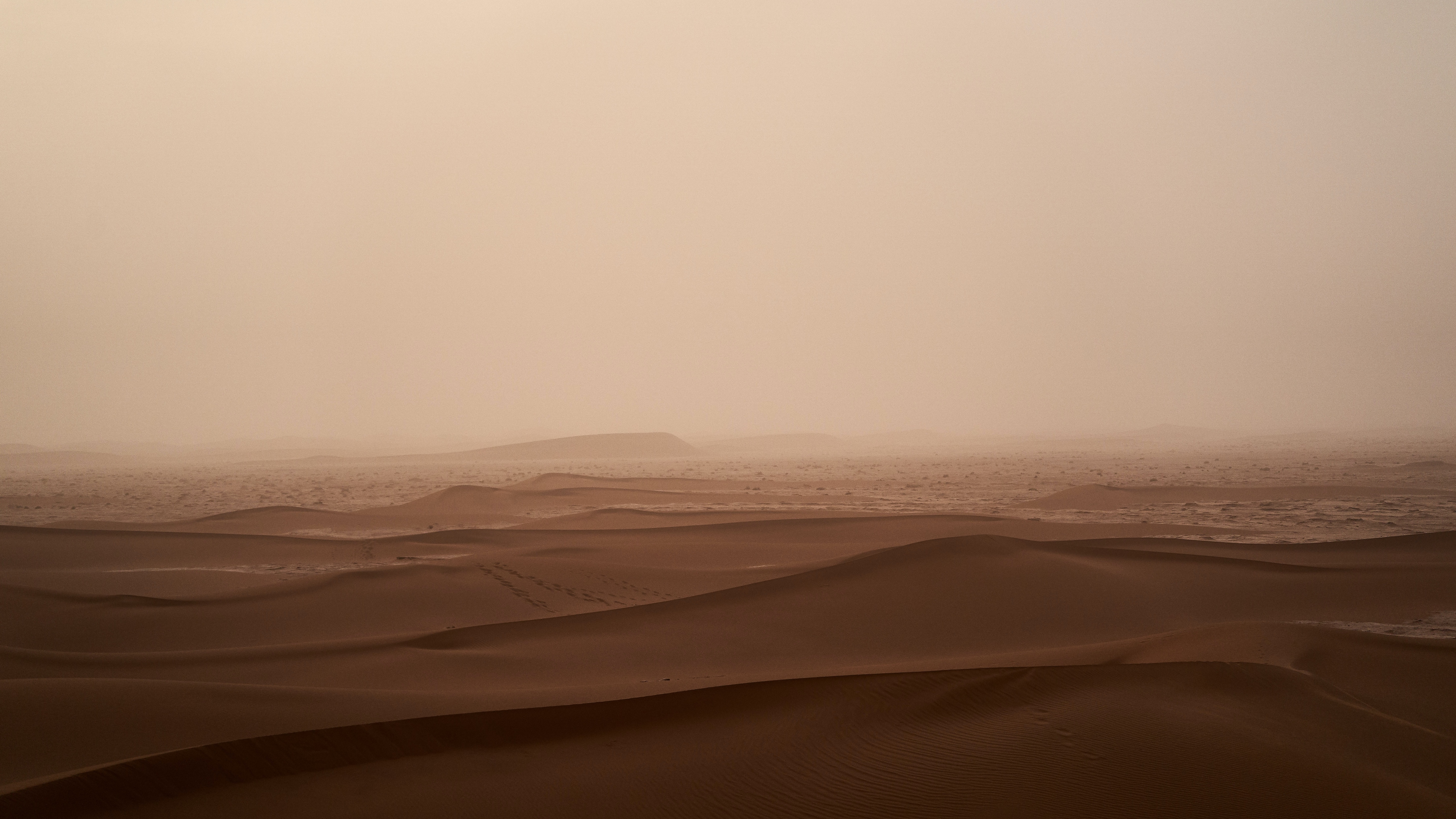 Description: A desert with a few sand dunes and a few hills in the distance with a foggy sky above.