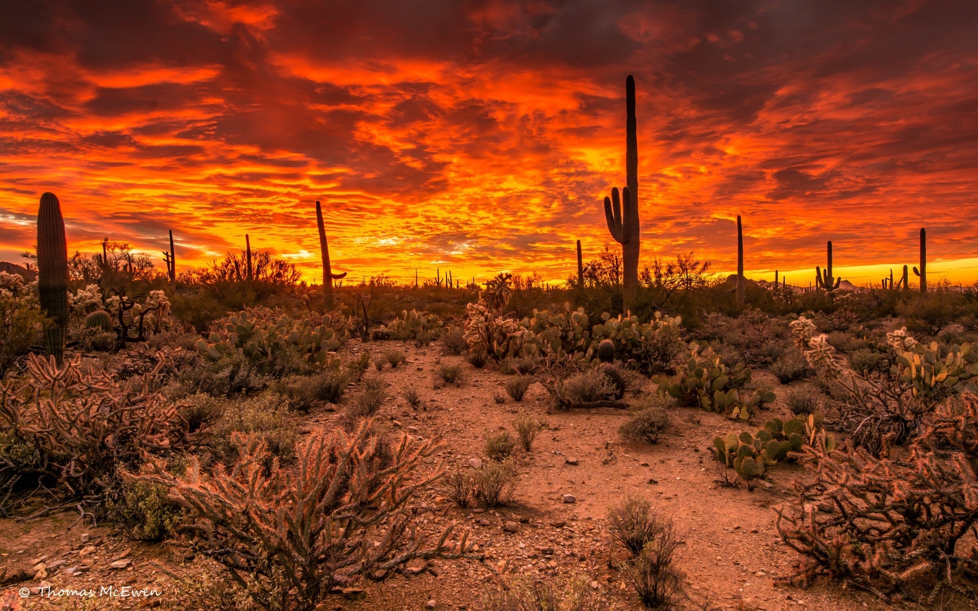 Description: A desert with a sunset and a cactus field with cacti and cacti in the foreground.