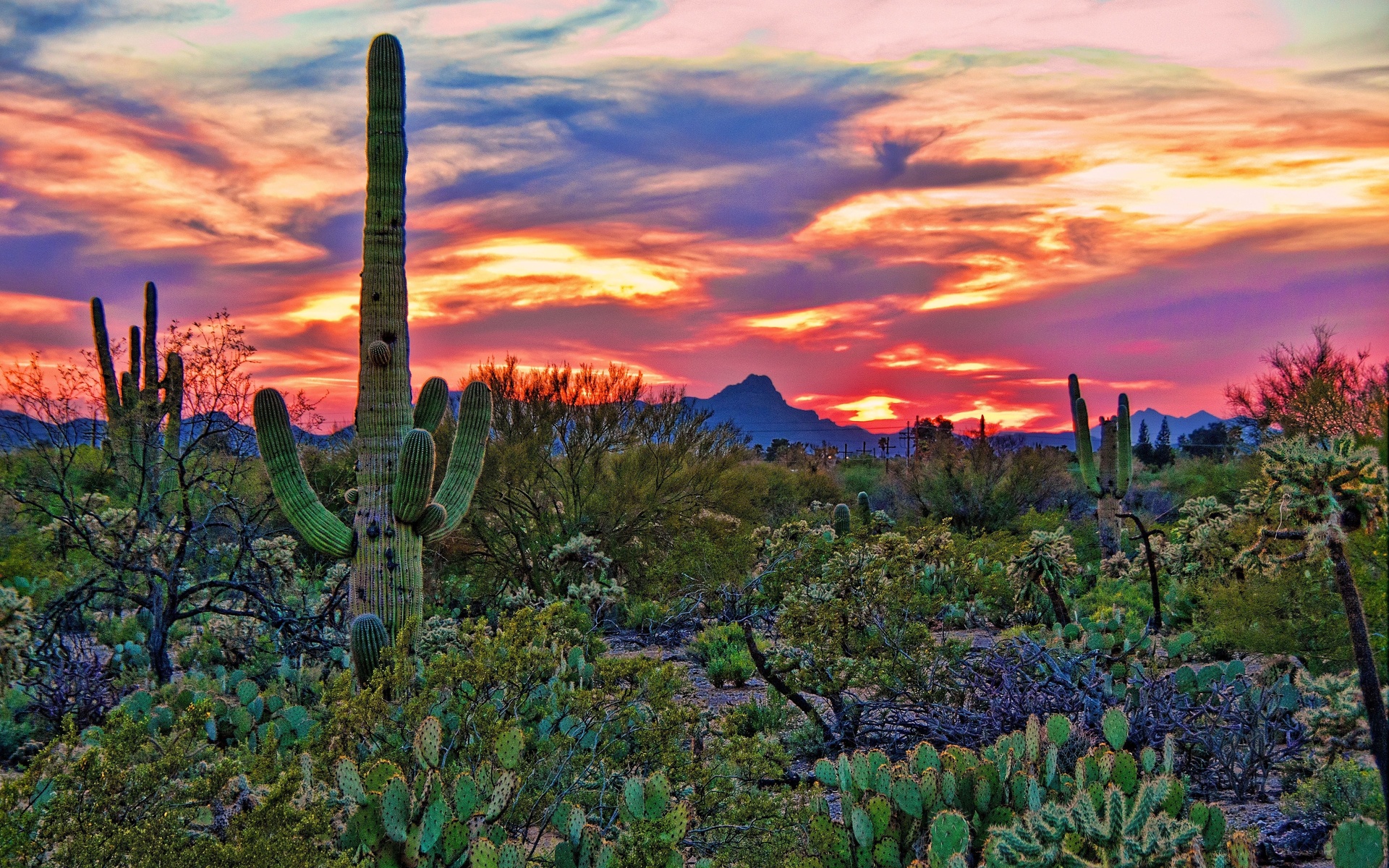 Description: A sunset in the desert with a cactus and other plants in the foreground and a mountain in the background.