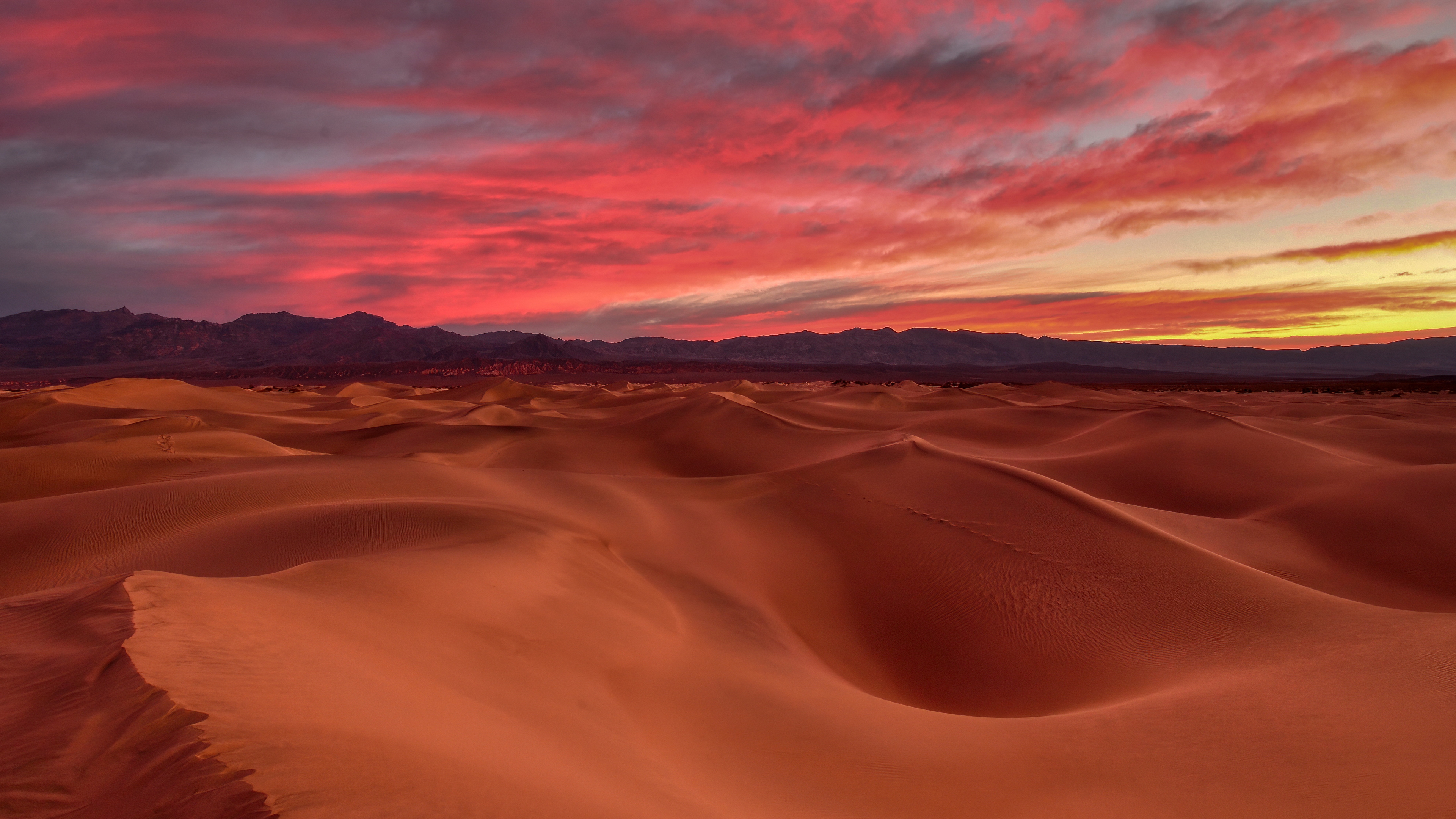 Description: A sunset over a desert with a red sky and clouds above it and mountains in the distance with a red and yellow sky.