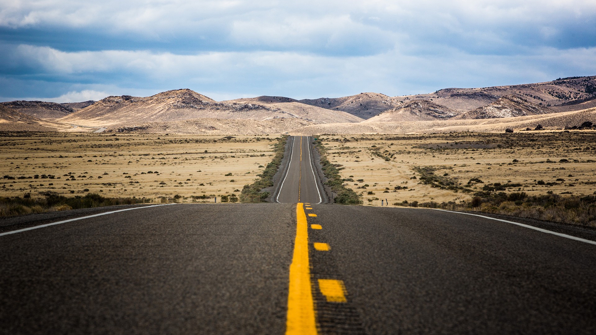 Description: A long straight road with a yellow line on the side of it in the middle of nowhere with mountains in the background.