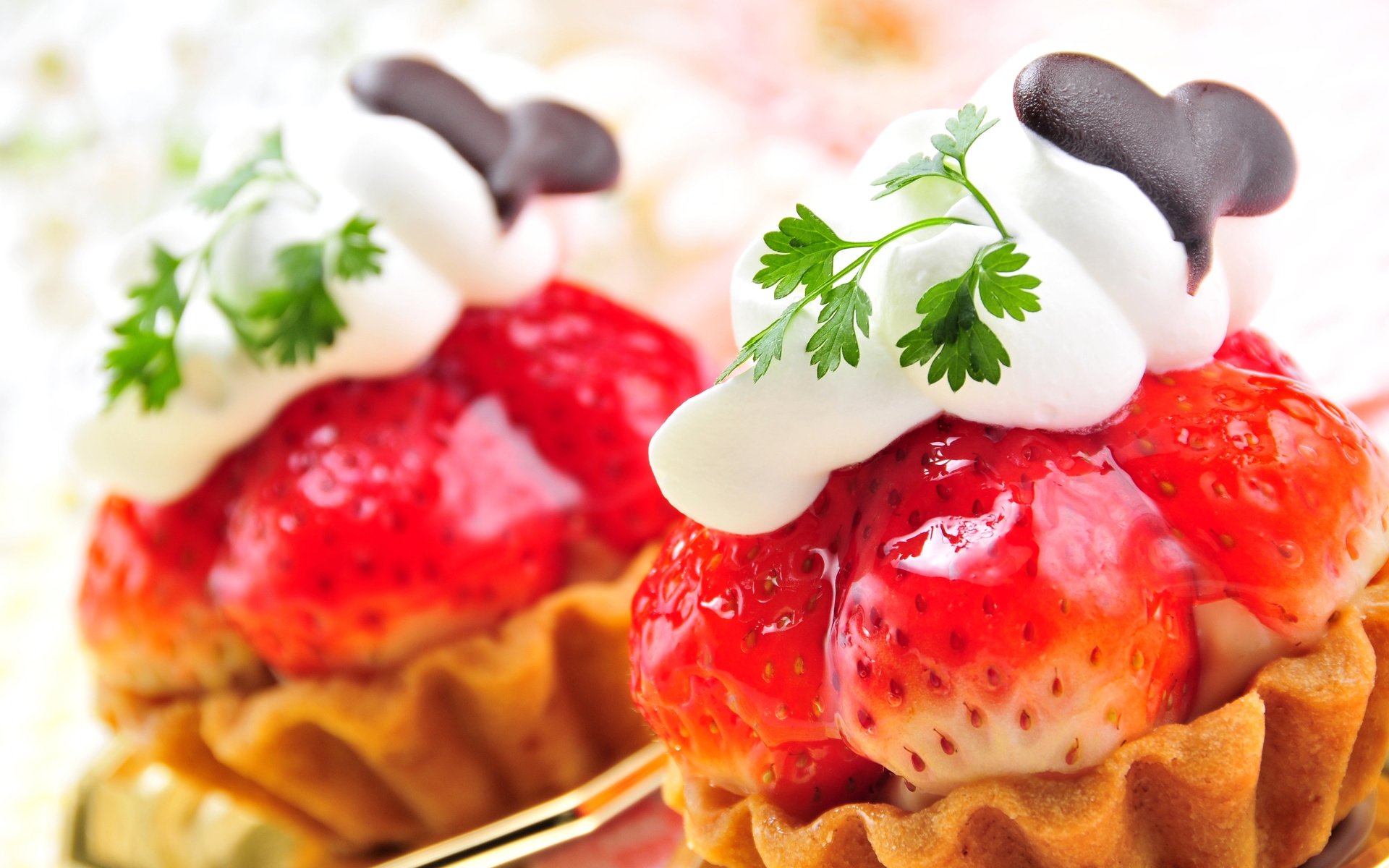 Description: A couple of desserts that are on a plate with a fork in it and some strawberries on top.
