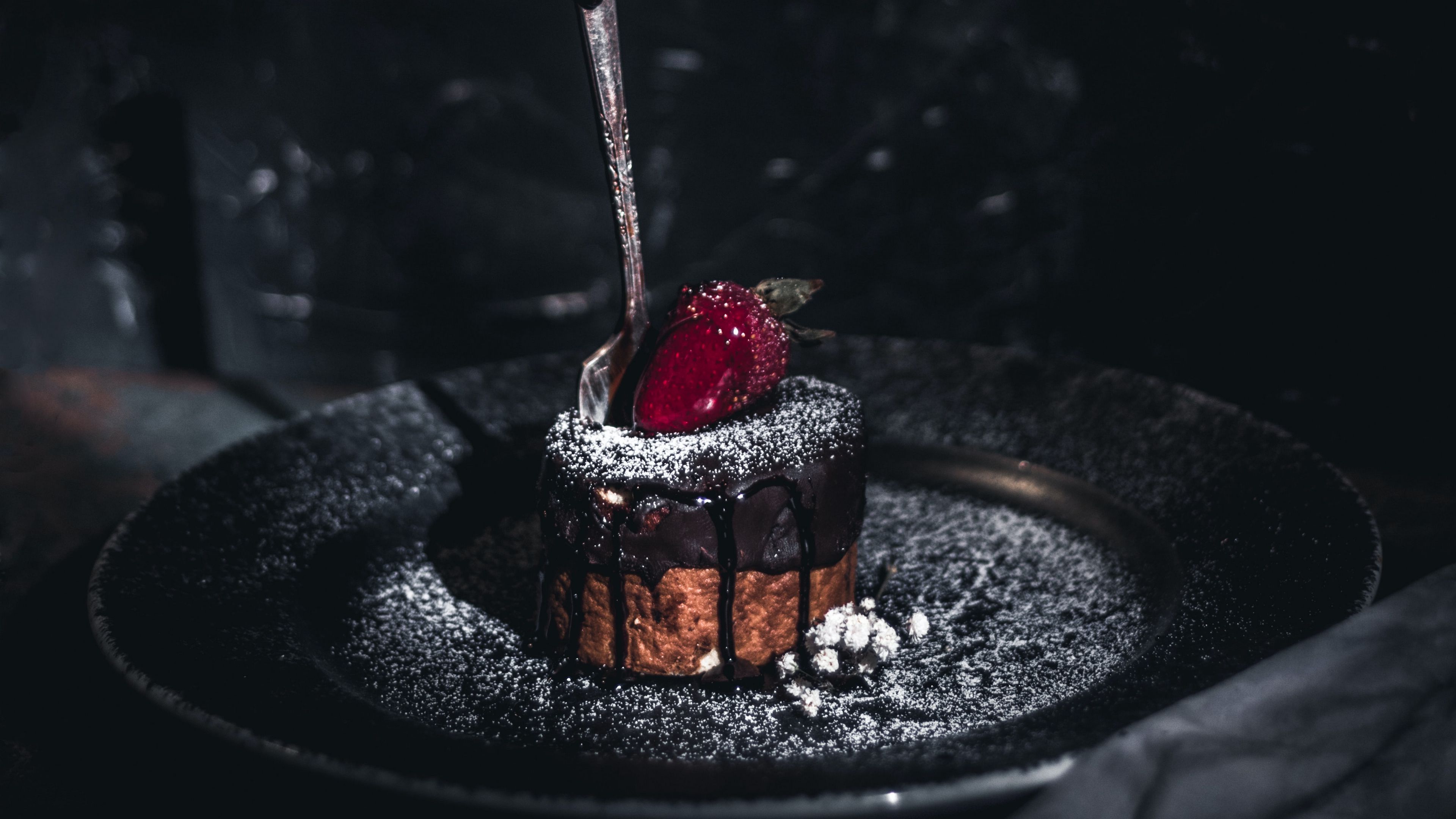 Description: A dessert with a strawberry on top of it on a plate with powdered sugar and a spoon in it.