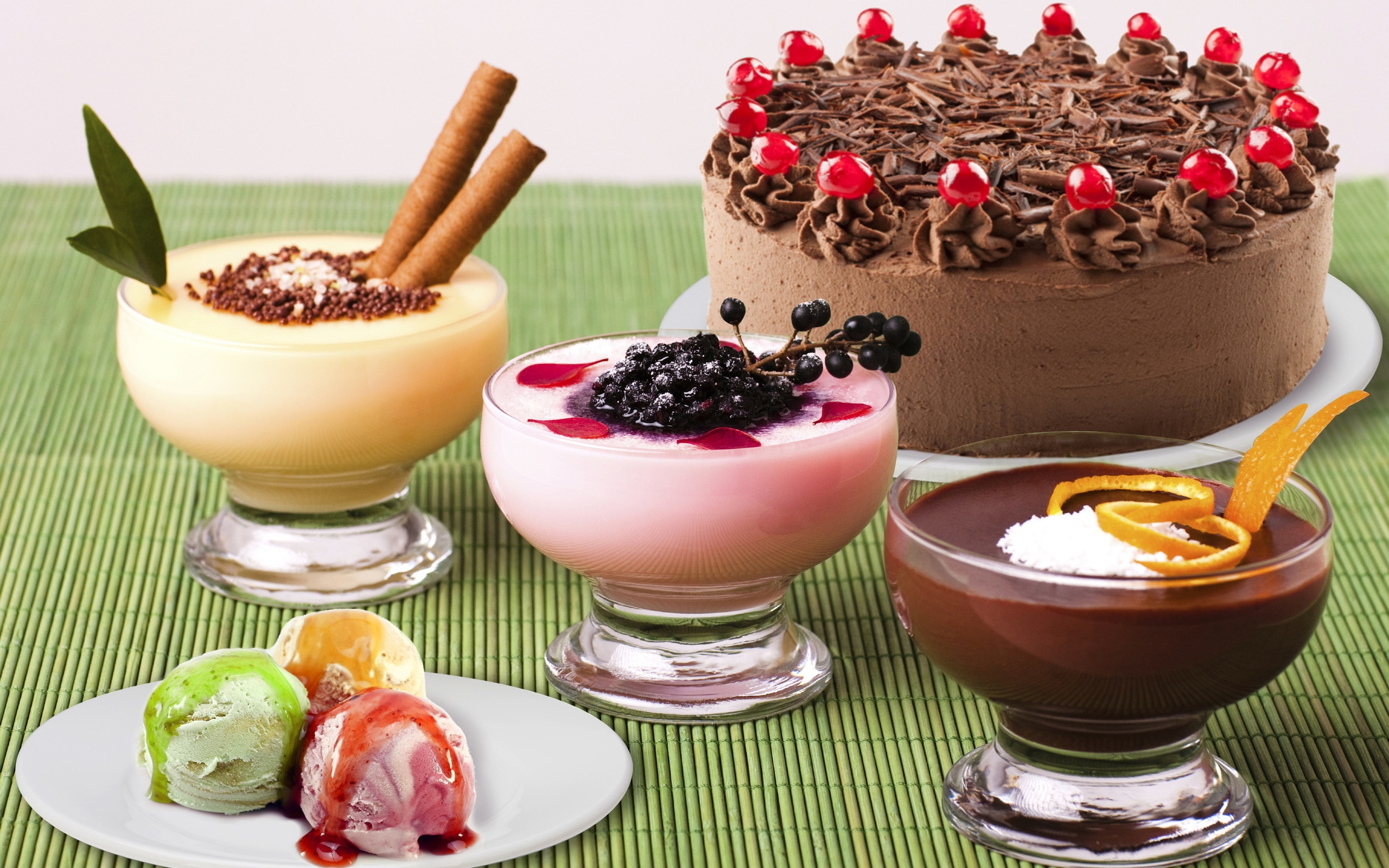 Description: A table topped with three desserts and a cake on top of a table cloth covered in green cloth.