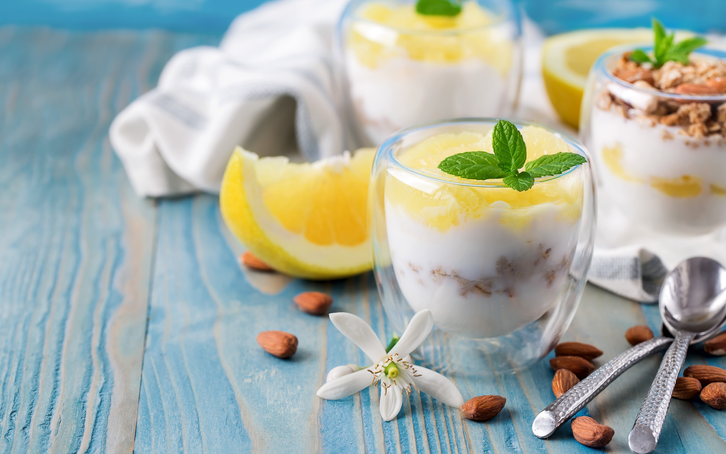 Description: A table topped with desserts and a spoon next to lemon slices and nuts on top of a blue table.