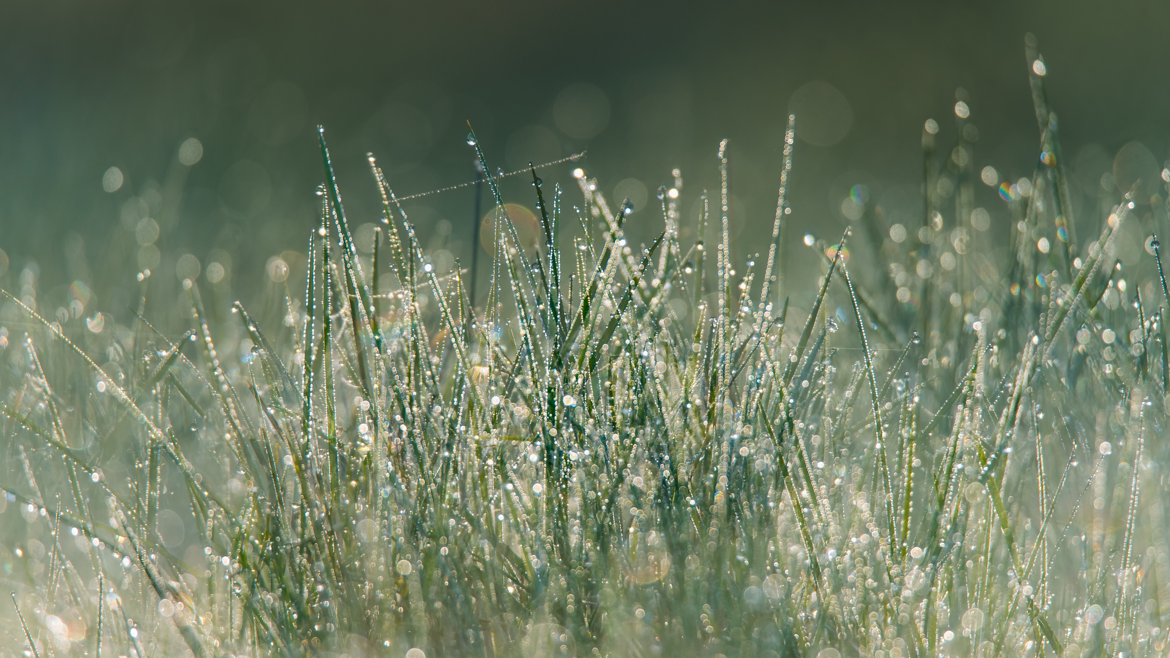 Description: A field with grass covered in dew and drops of water on it's surface.