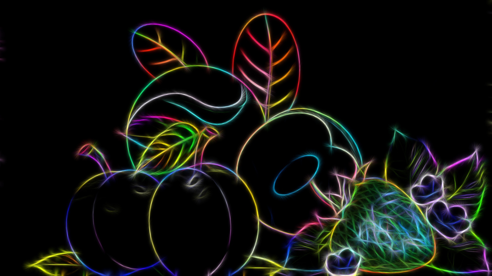 Description: A digital painting of a bunch of fruit on a black background with a neon effect of leaves and berries.