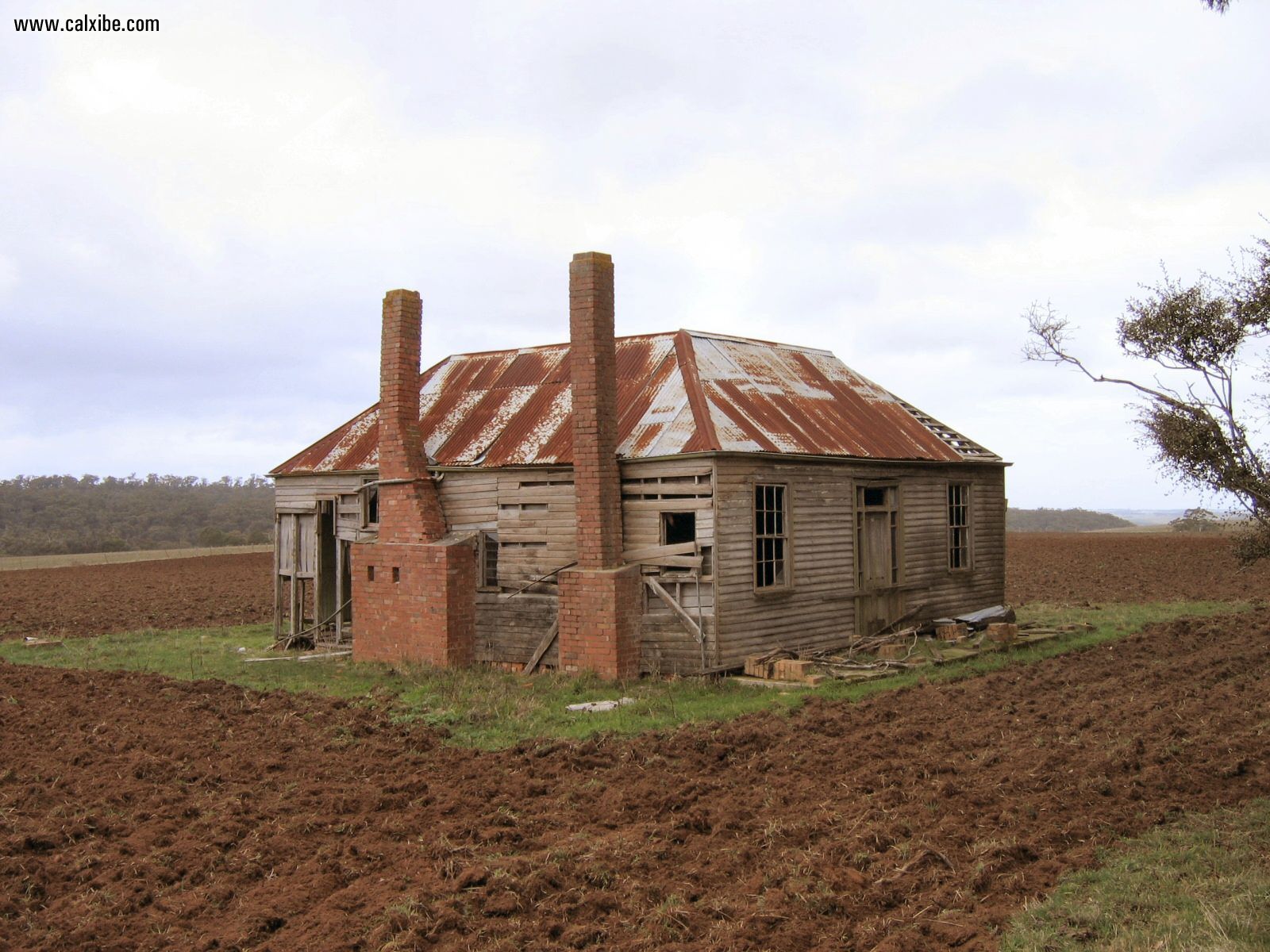 Description: A dilapidated building in a field with a tree in the background and a sky background with clouds in the distance.