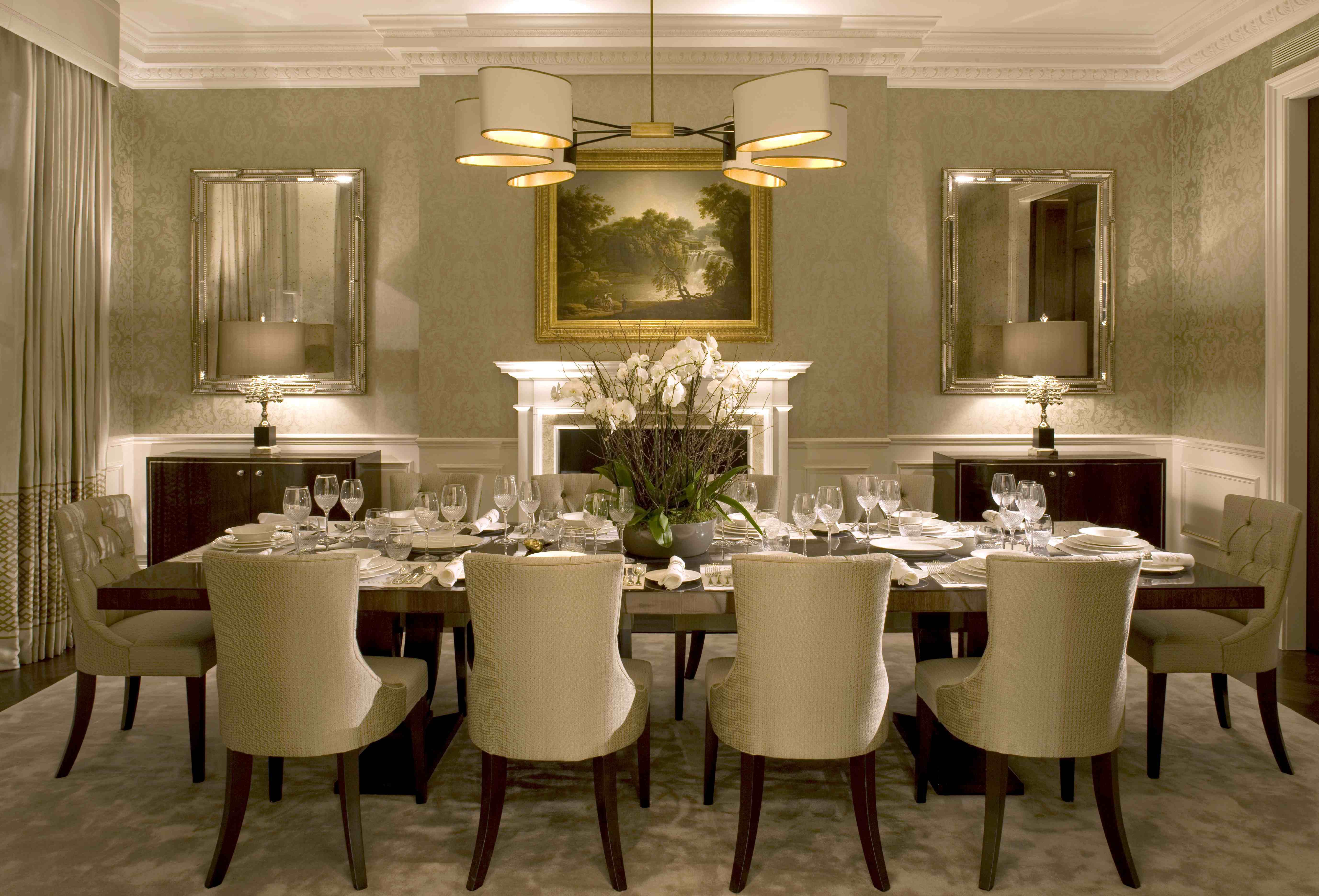 Description: A dining room with a table and chairs and a painting on the wall above it with a painting of a landscape.