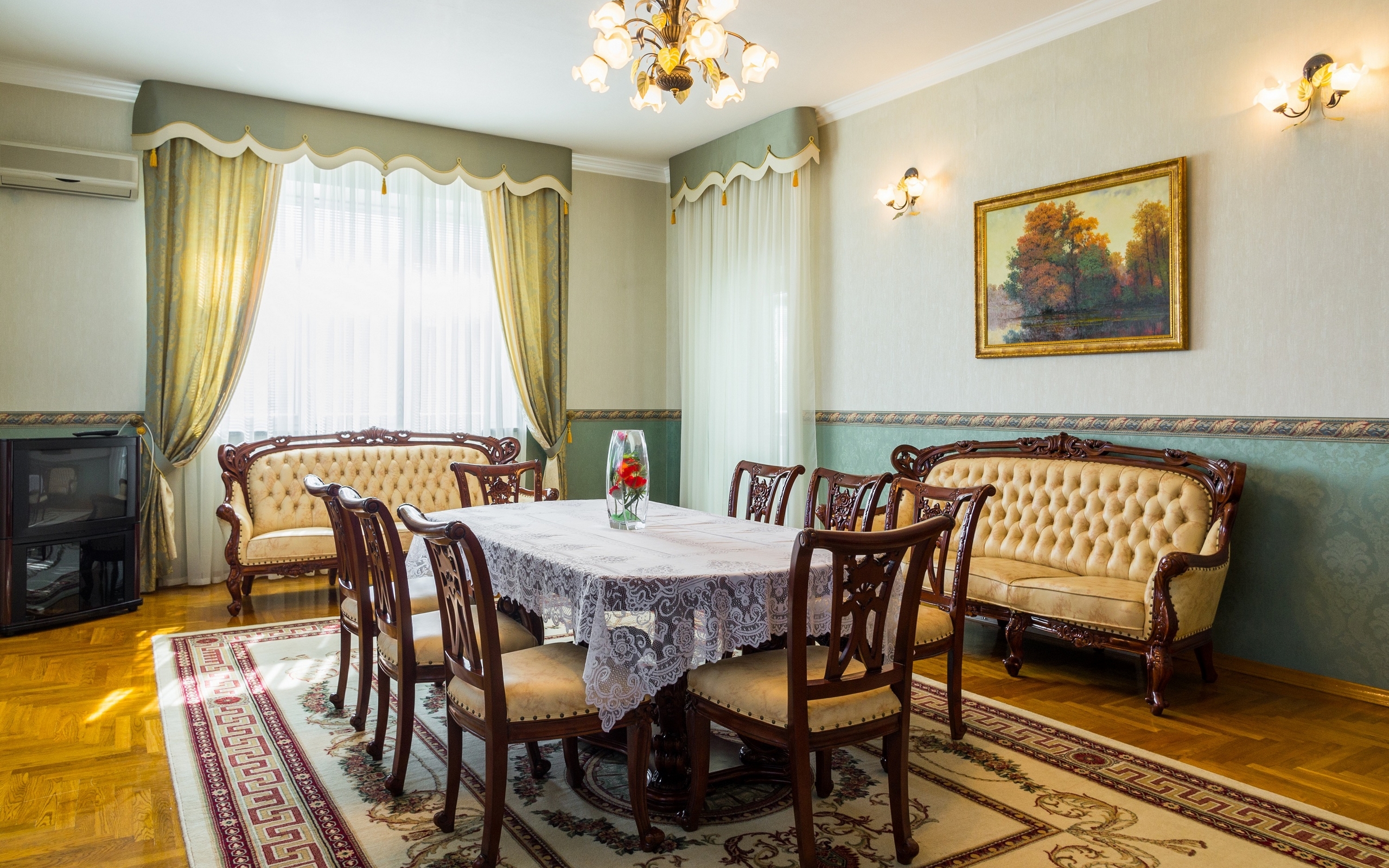 Description: A dining room with a table and chairs and a rug on the floor and a painting on the wall.