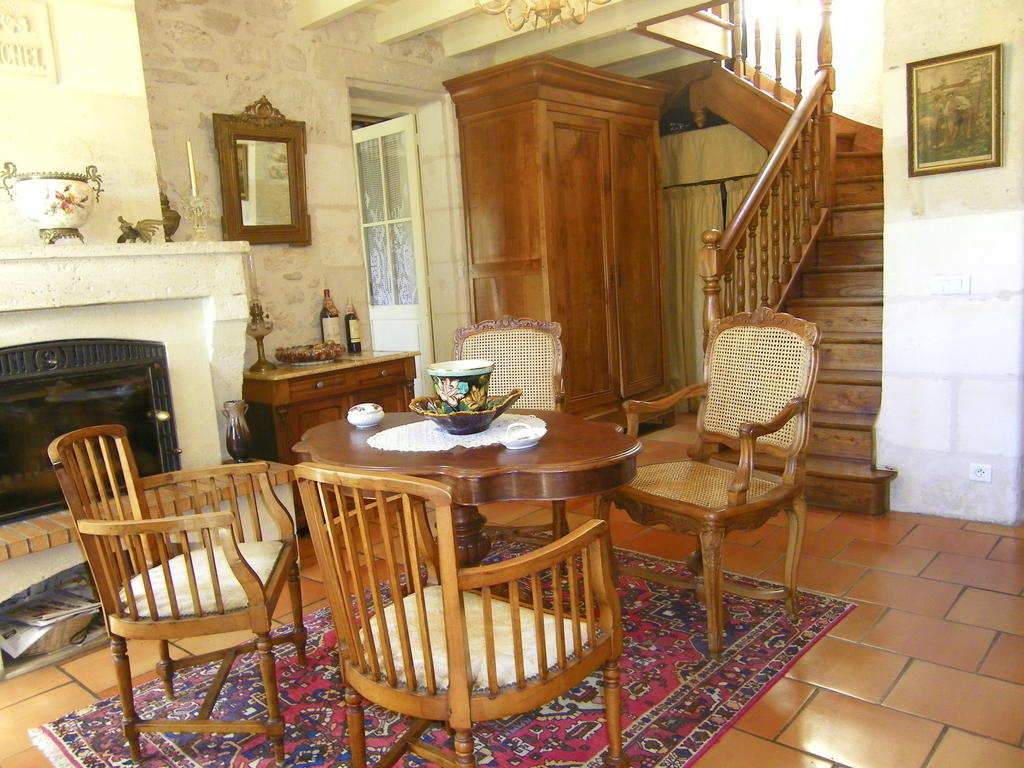 Description: A dining room table with chairs and a vase on it in front of a fireplace with a staircase in the background.