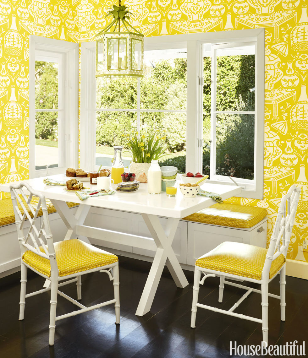 Description: A dining room with yellow and white wallpaper and a table with yellow chairs and a white bench with yellow cushions.