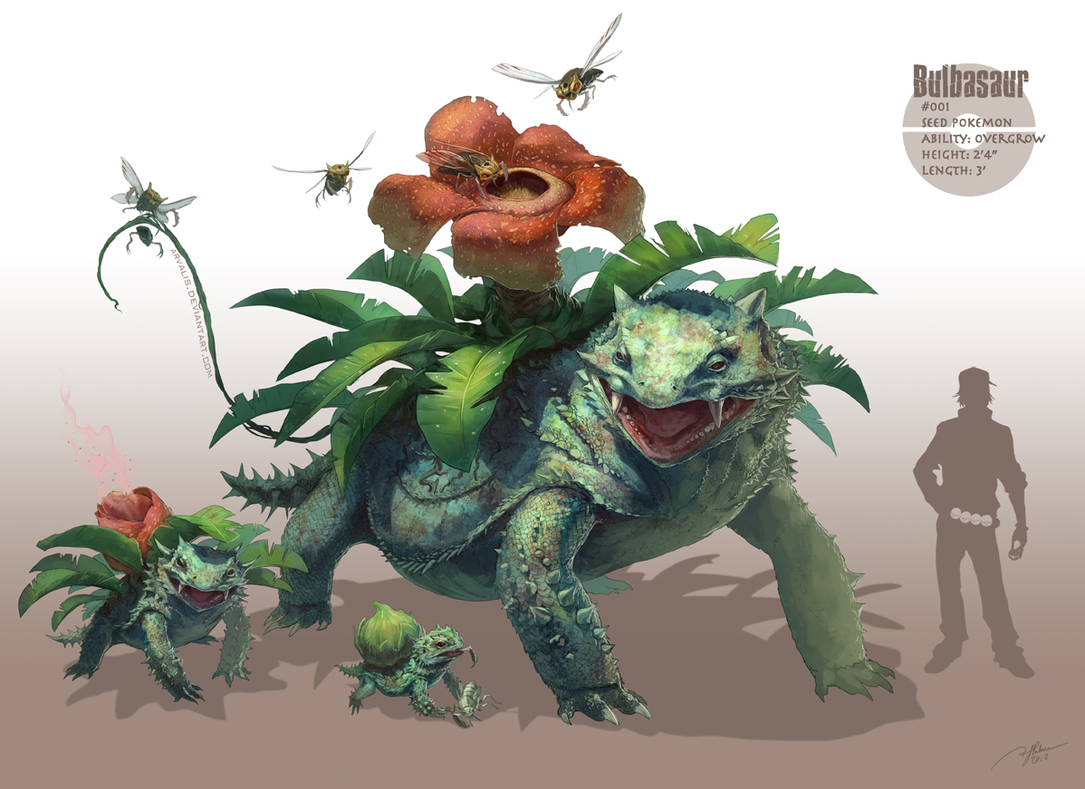 Description: A drawing of a dinosaur with flowers on its back and a man standing next to it with a flower on its back.