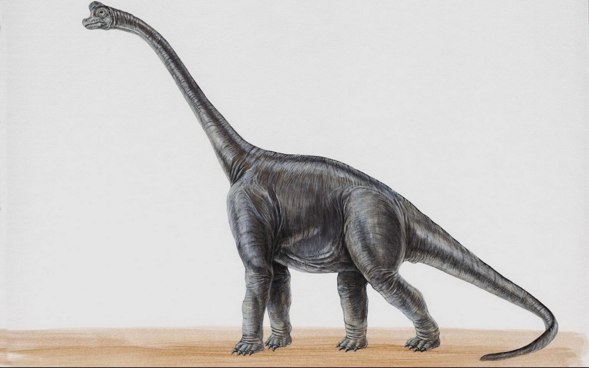 Description: A drawing of a dinosaur standing on a wooden floor with a white background and a light colored background behind it.