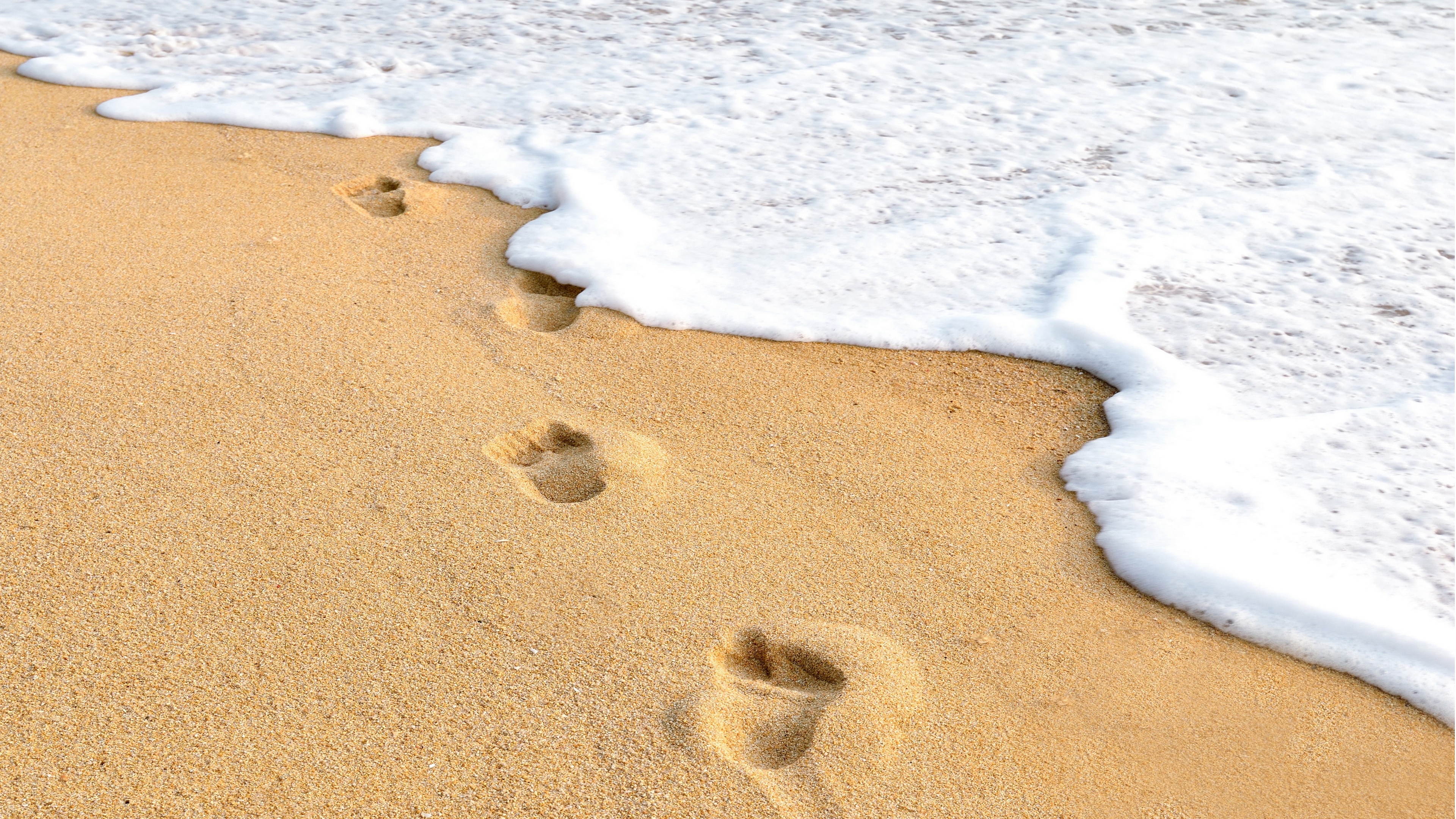 Description: A beach with footprints in the sand and a wave coming in to shore with a surfboard on it.