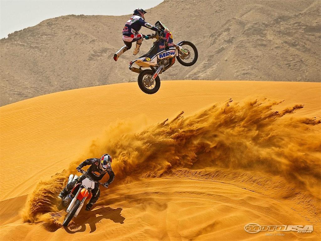 Description: Two people on dirt bikes jumping over a sand dune in the desert with a mountain in the background and a person on a dirt bike in the air.