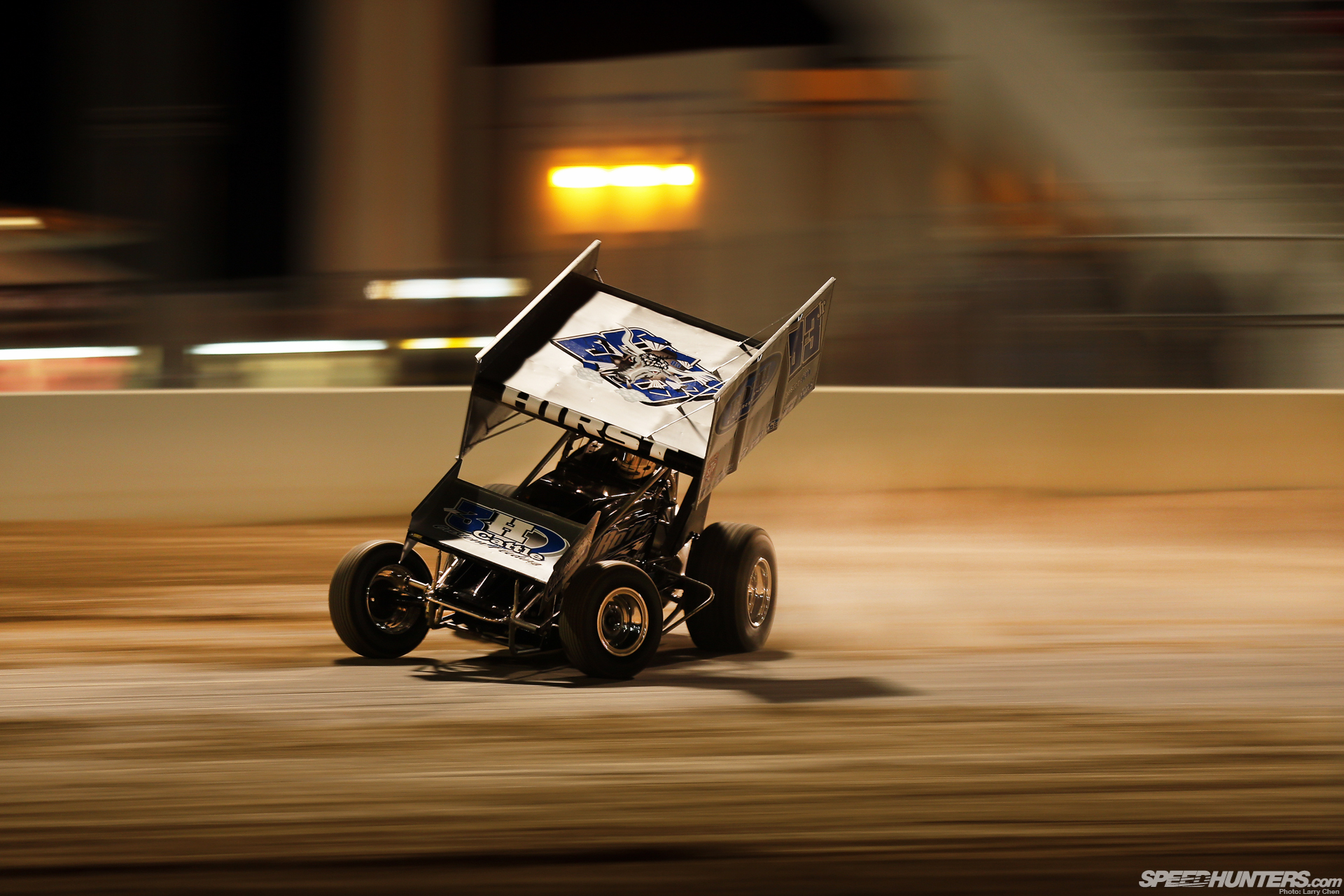 Description: A dirt buggy is racing on a track at night time with a flag on top of it and a flag on the side of the track.