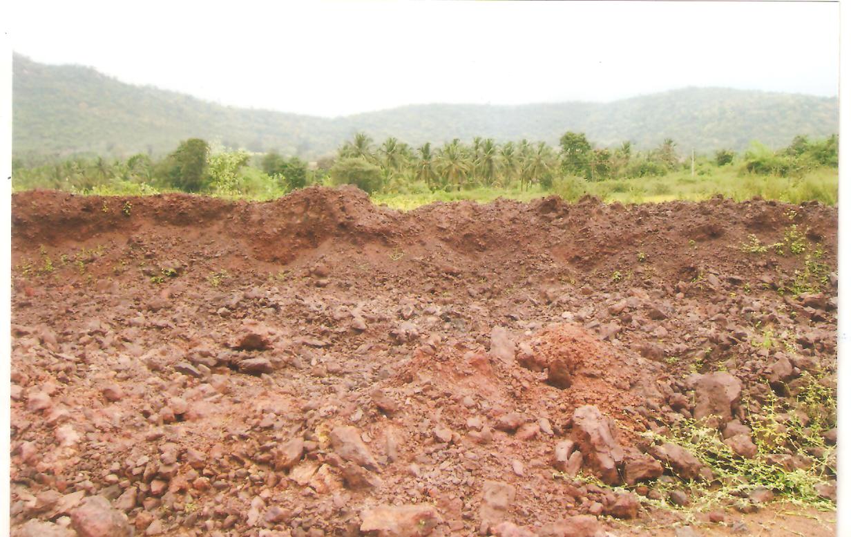 Description: A dirt field with a mountain in the background and trees in the distance with a sky background and a white sky.