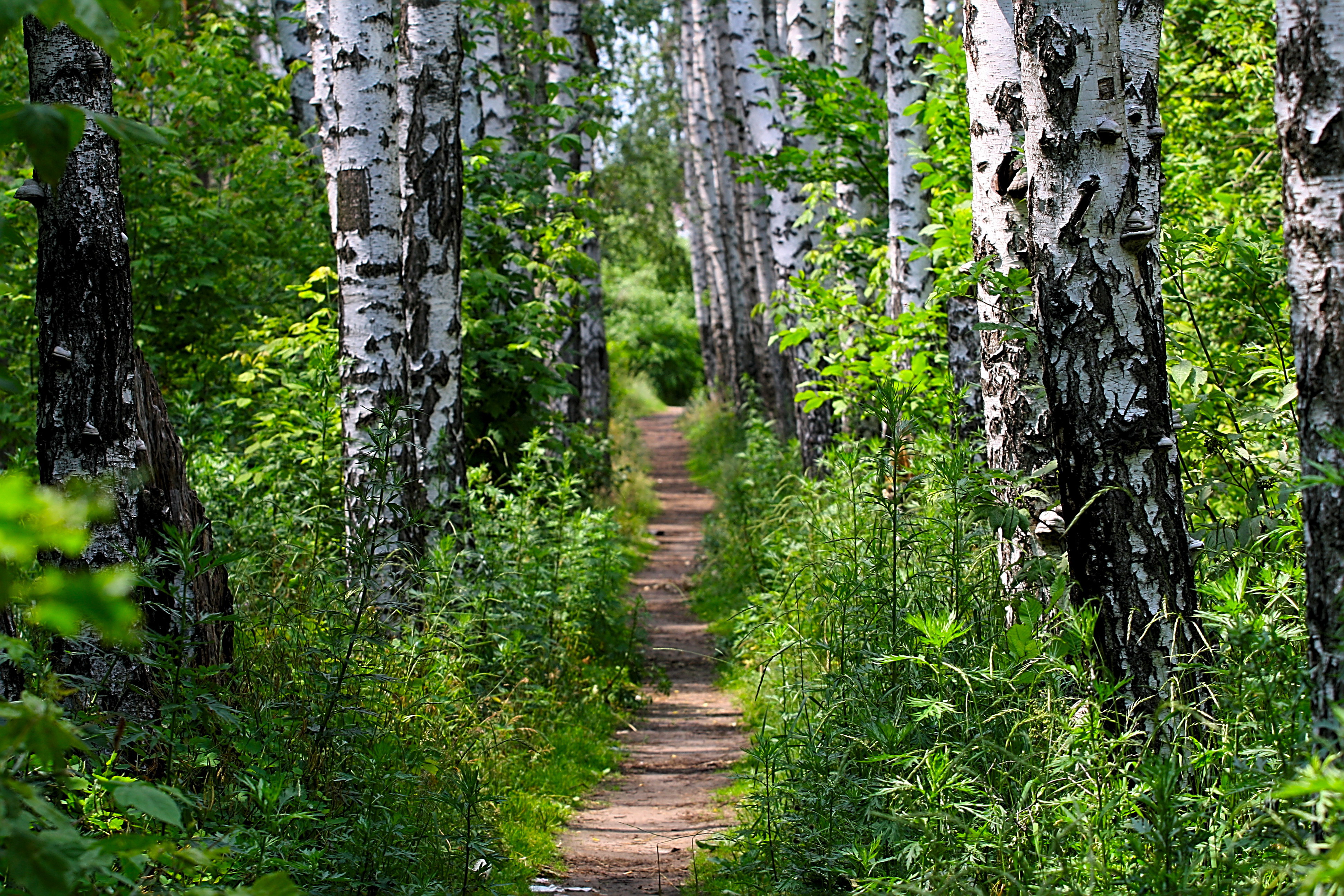 Description: A dirt path in a forest with lots of trees and grass on both sides of it and a bear on the other side.