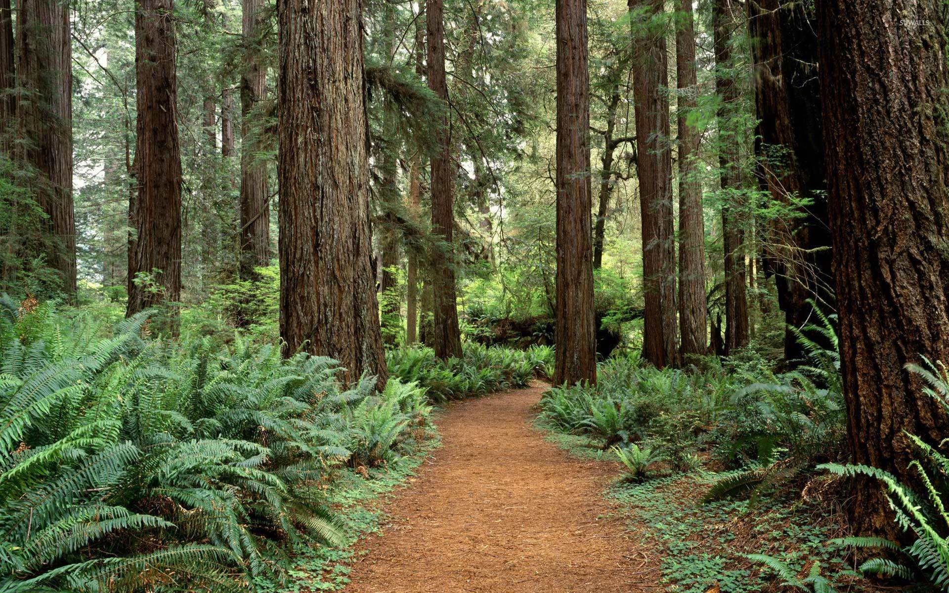 Description: A dirt path in a forest with lots of trees and ferns on both sides of it and a dirt path leading to the top of the trees.