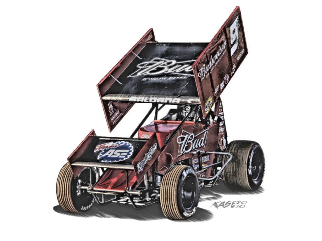 Description: A drawing of a dirt racing car with a flag on top of it's head and a sign on the side of the car.