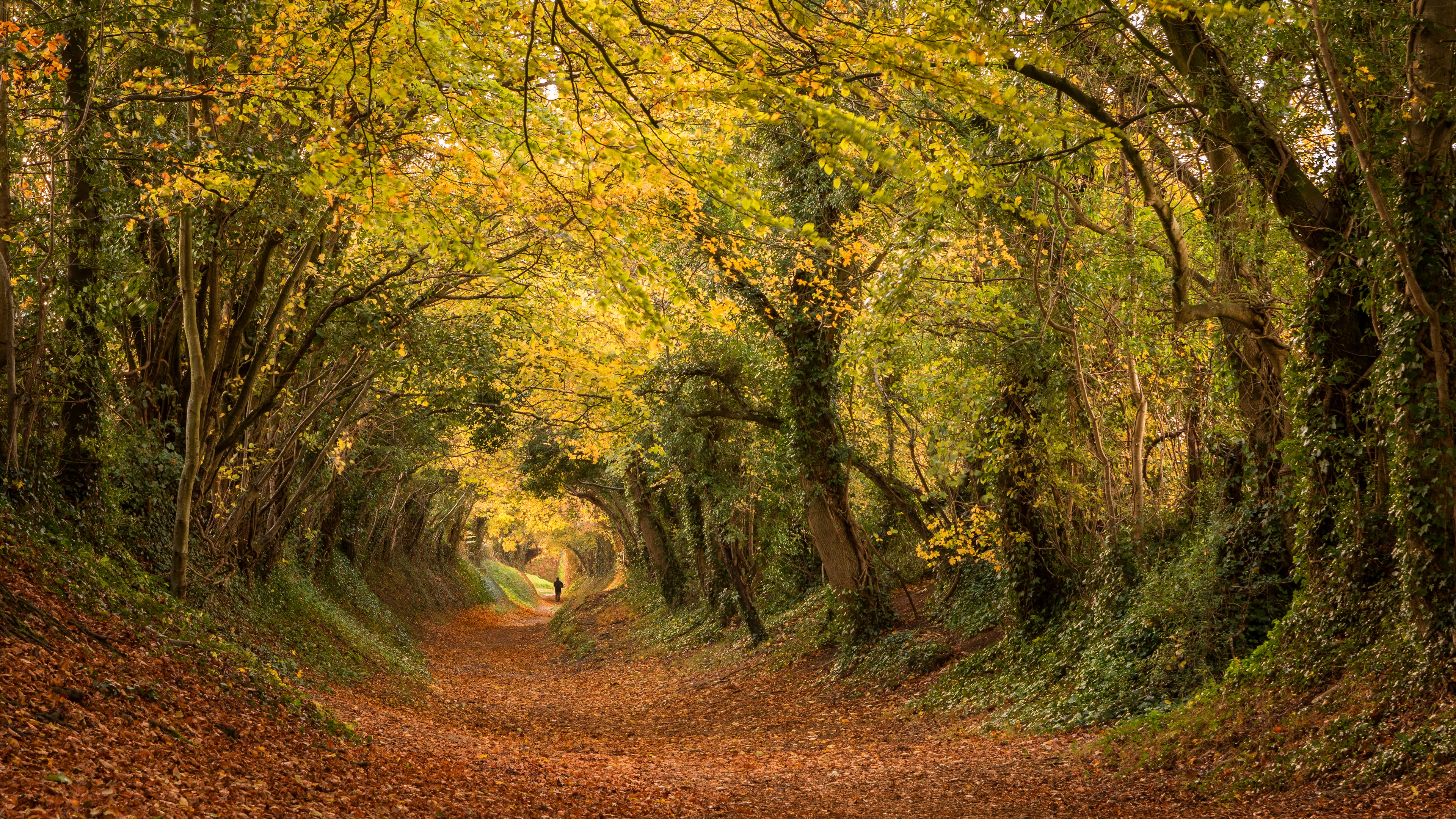 Description: A dirt road surrounded by trees and leaves in the fall time with a person walking down the road in the distance.