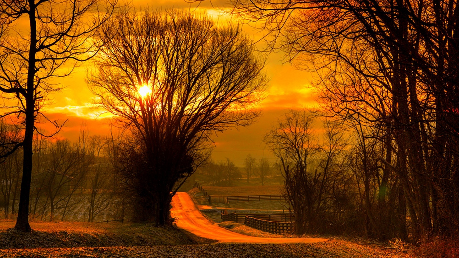Description: A dirt road with trees and a fence in the background at sunset or dawn with a yellow light coming from the sky.