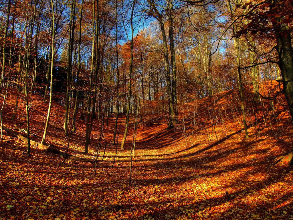 Description: A dirt road surrounded by trees and leaves in the fall season with a blue sky in the background and a few orange leaves on the ground.