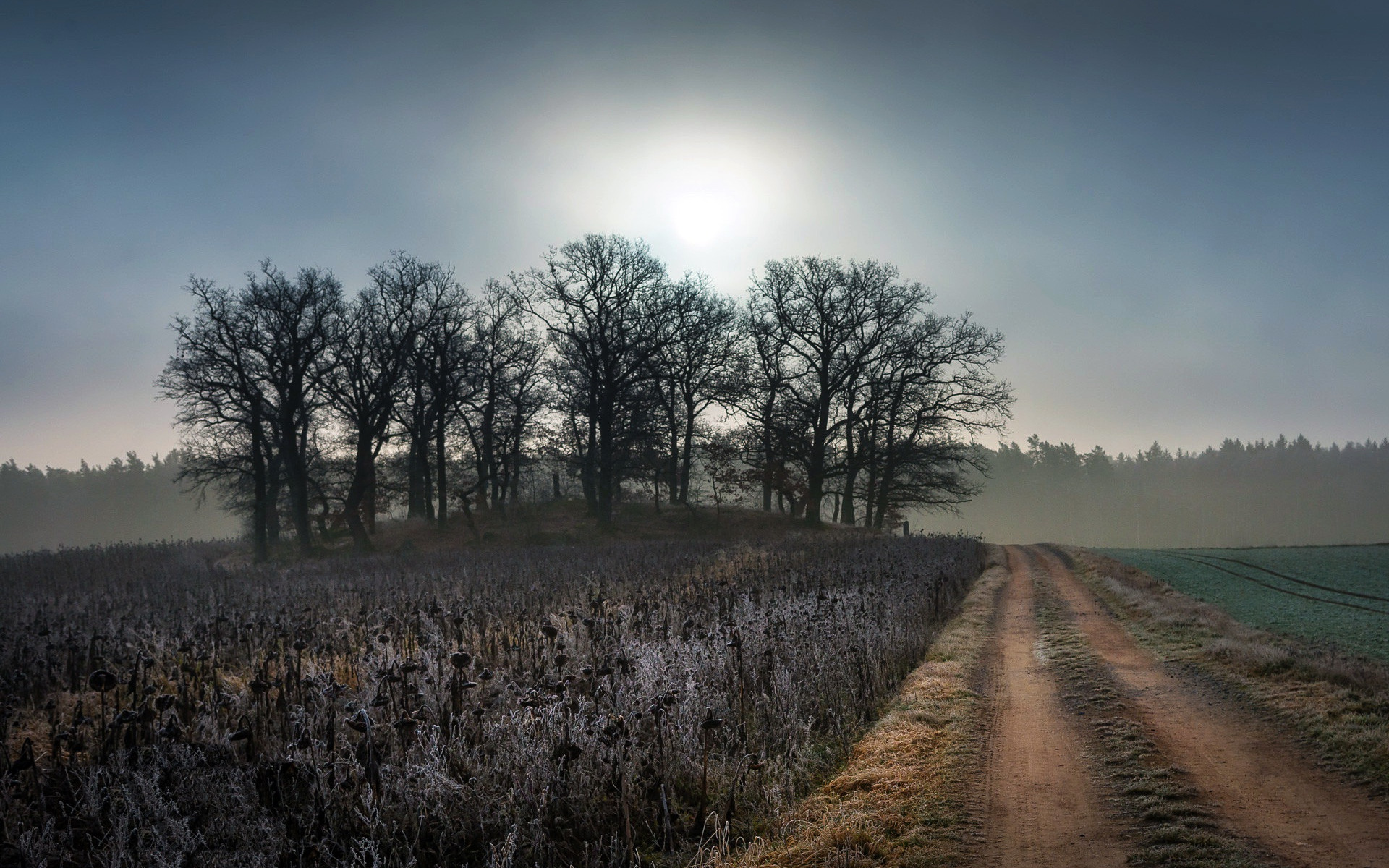 Description: A dirt road in a field with trees on the other side of it and a sun shining through the fog.