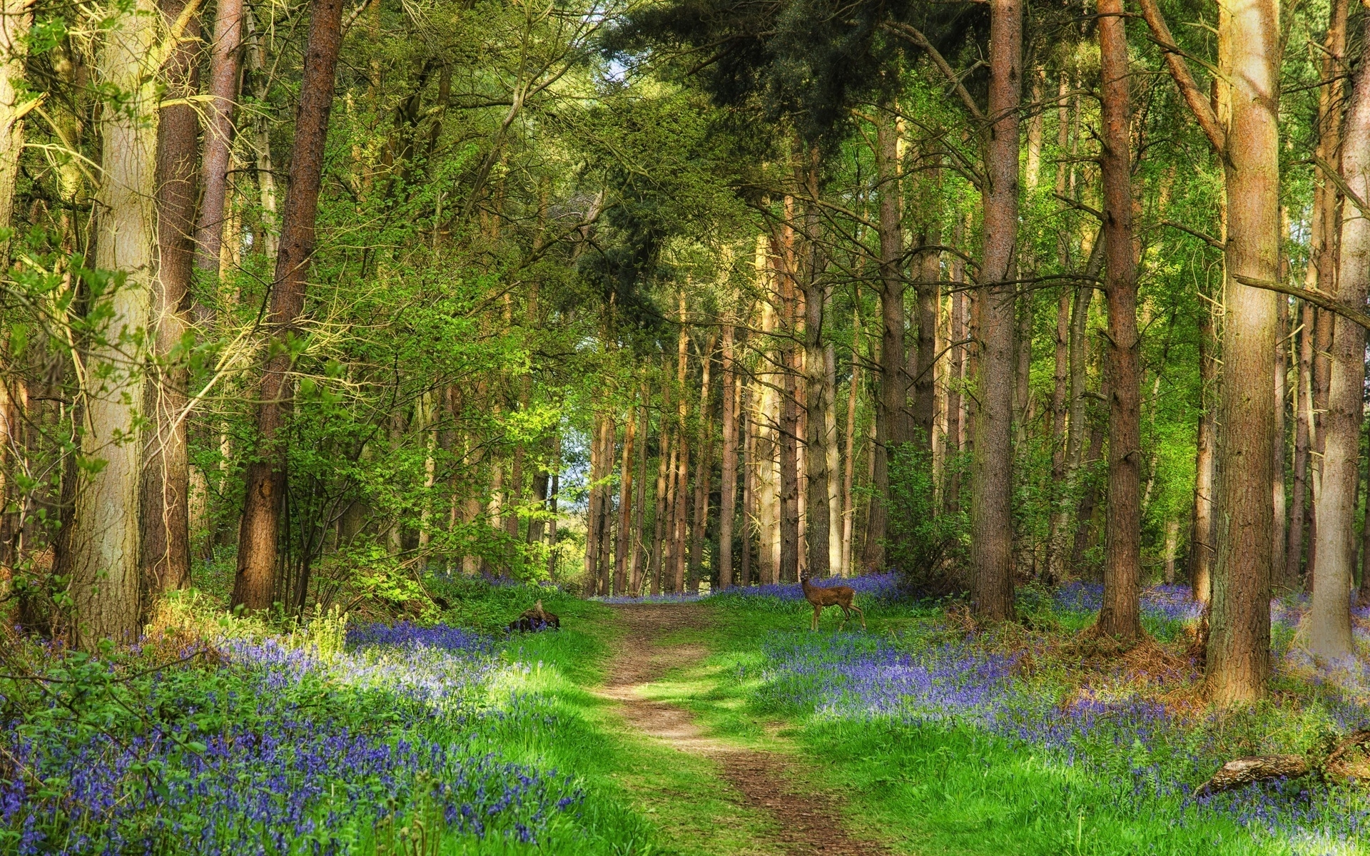 Description: A dirt road in a forest with bluebells and trees on both sides of it and a forest of tall trees on the other side.