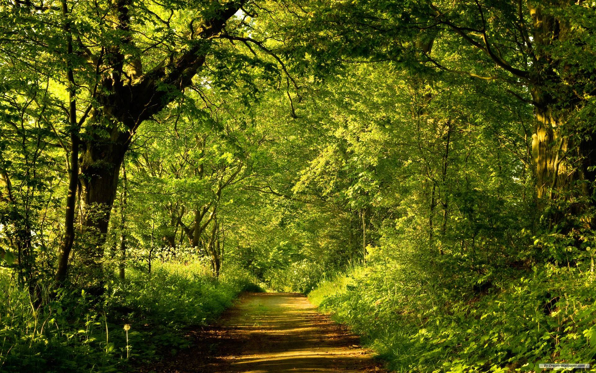 Description: A dirt road surrounded by trees and grass in the middle of a forest with lots of green leaves on the trees.