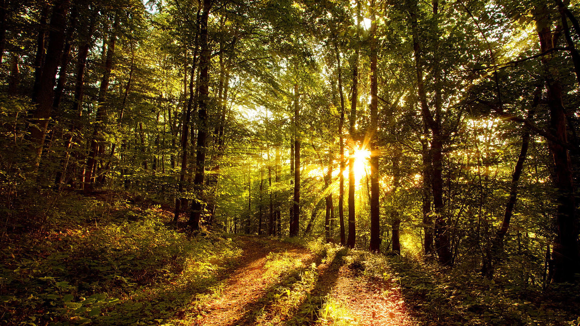 Description: A dirt road in the middle of a forest with the sun shining through the trees on the other side.